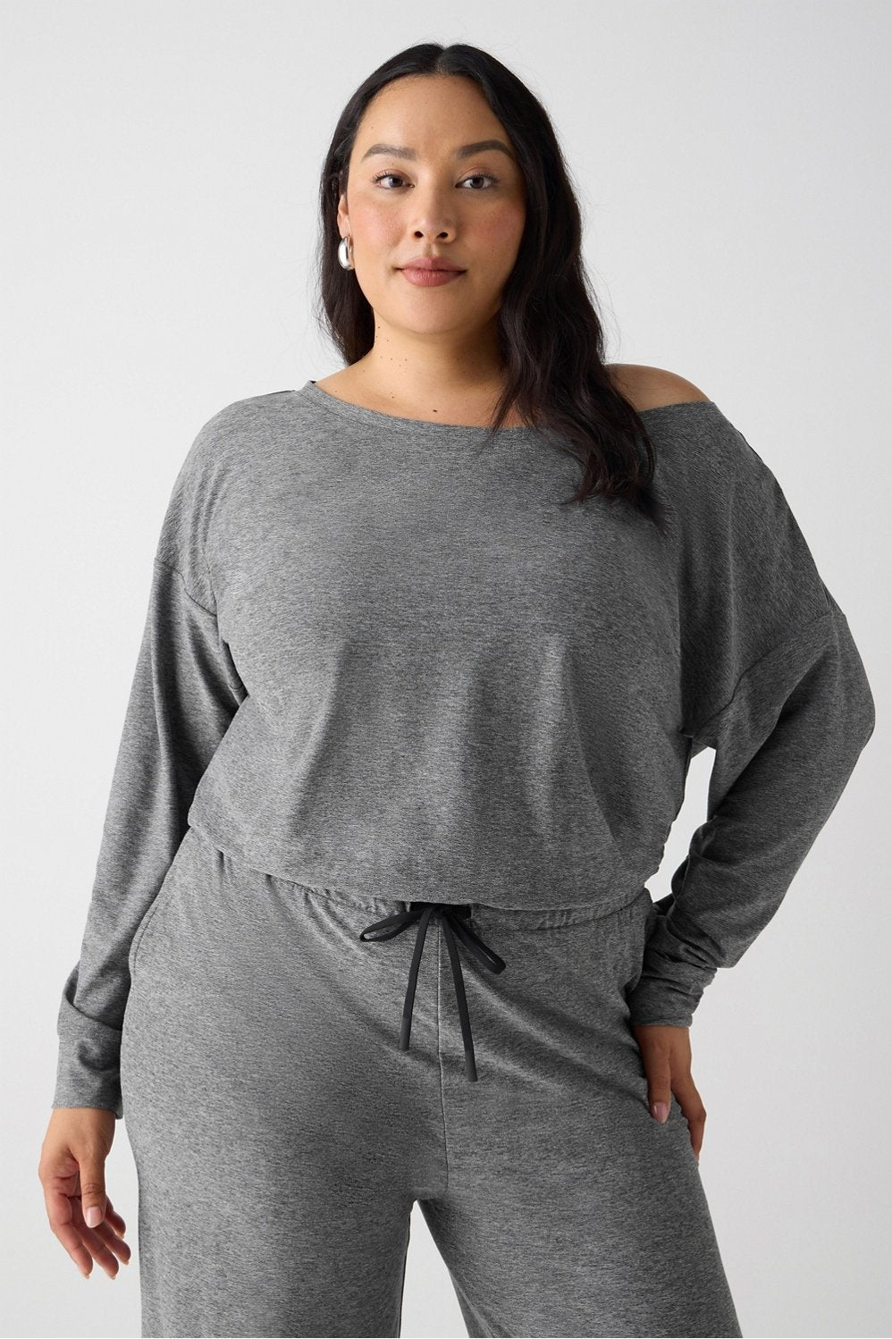 Soft, breathable, and effortless. This onesie features a chic off-the-shoulder neckline and relaxed silhouette. The perfect mix of cozy comfort and elevated style.