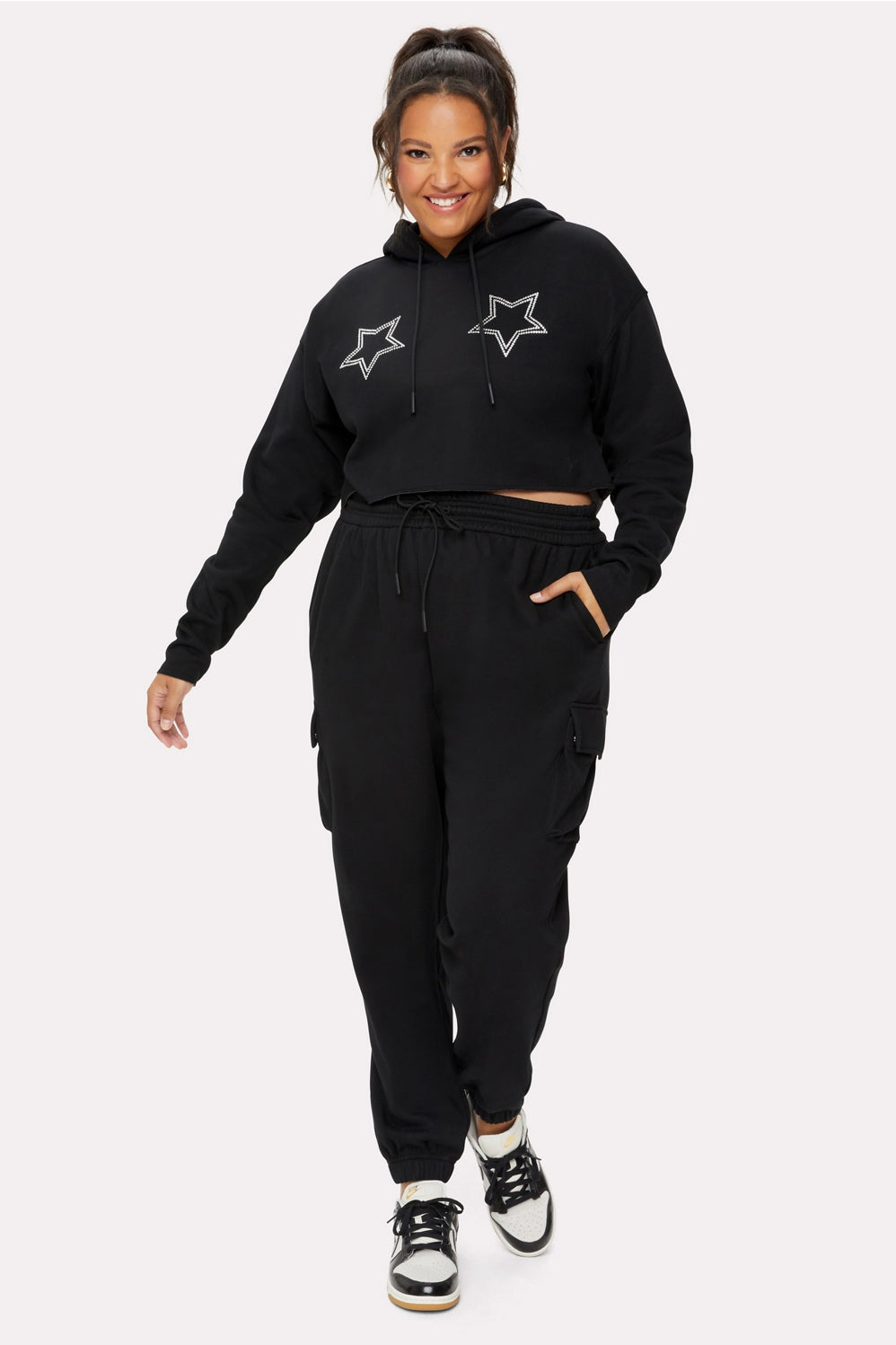 Make a statement with this eye-catching cropped hoodie. Starry rhinestone details and raw edges turn up the effortlessly cool vibe. Rock it with matching Cozy Fleece Joggers for all-day softness and comfort.
