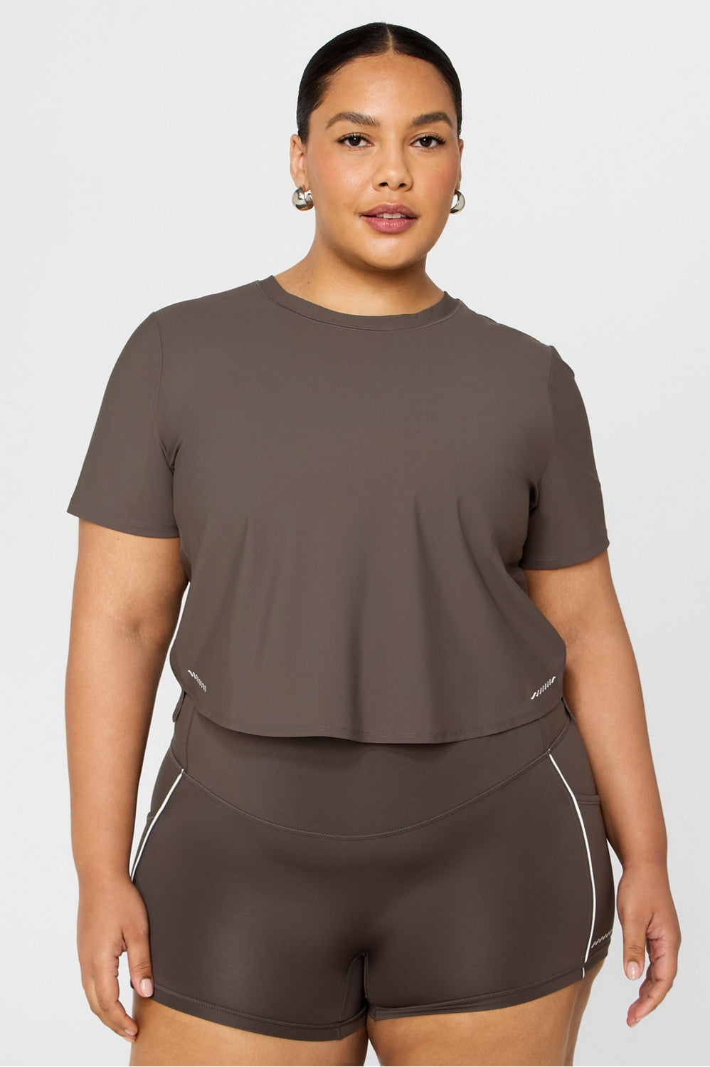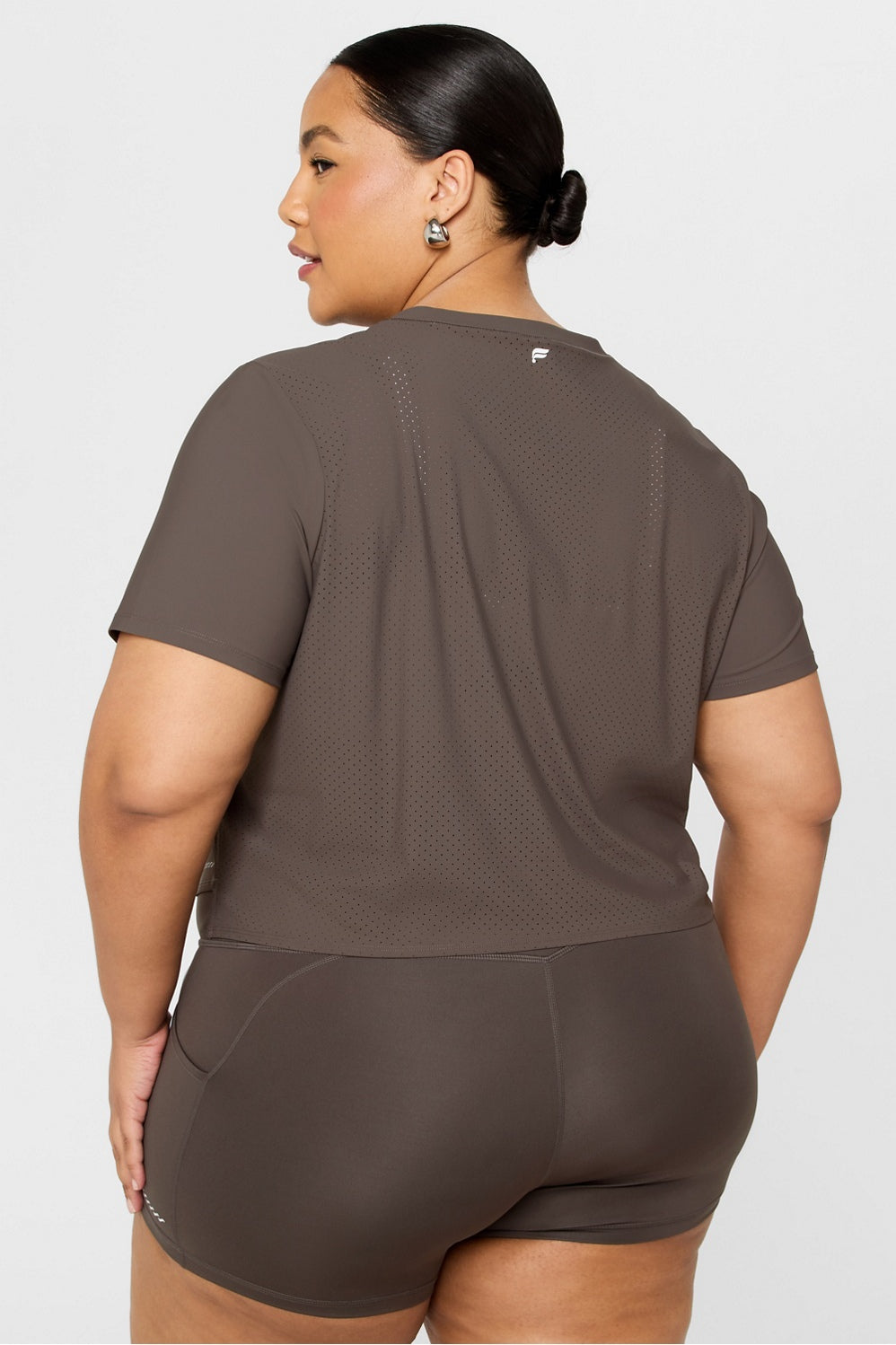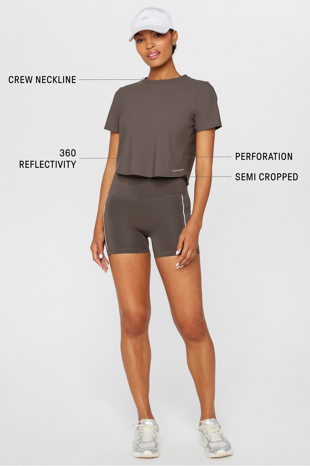 Beat the heat. This lightweight short-sleeve tee is designed for your highest-sweat workouts, with moisture-wicking tech, breathable perforation, and 360 reflectivity. It offers a semi-cropped length and boxy fit for all-day airflow.