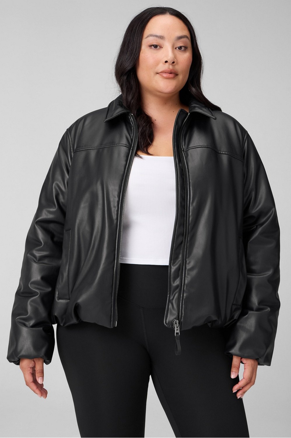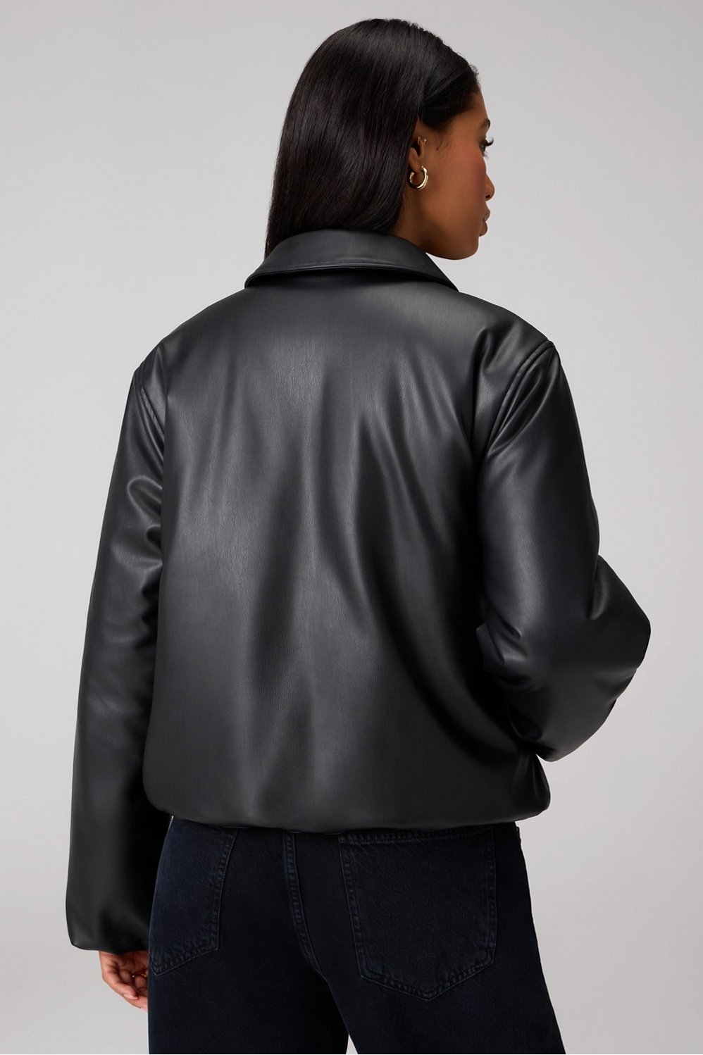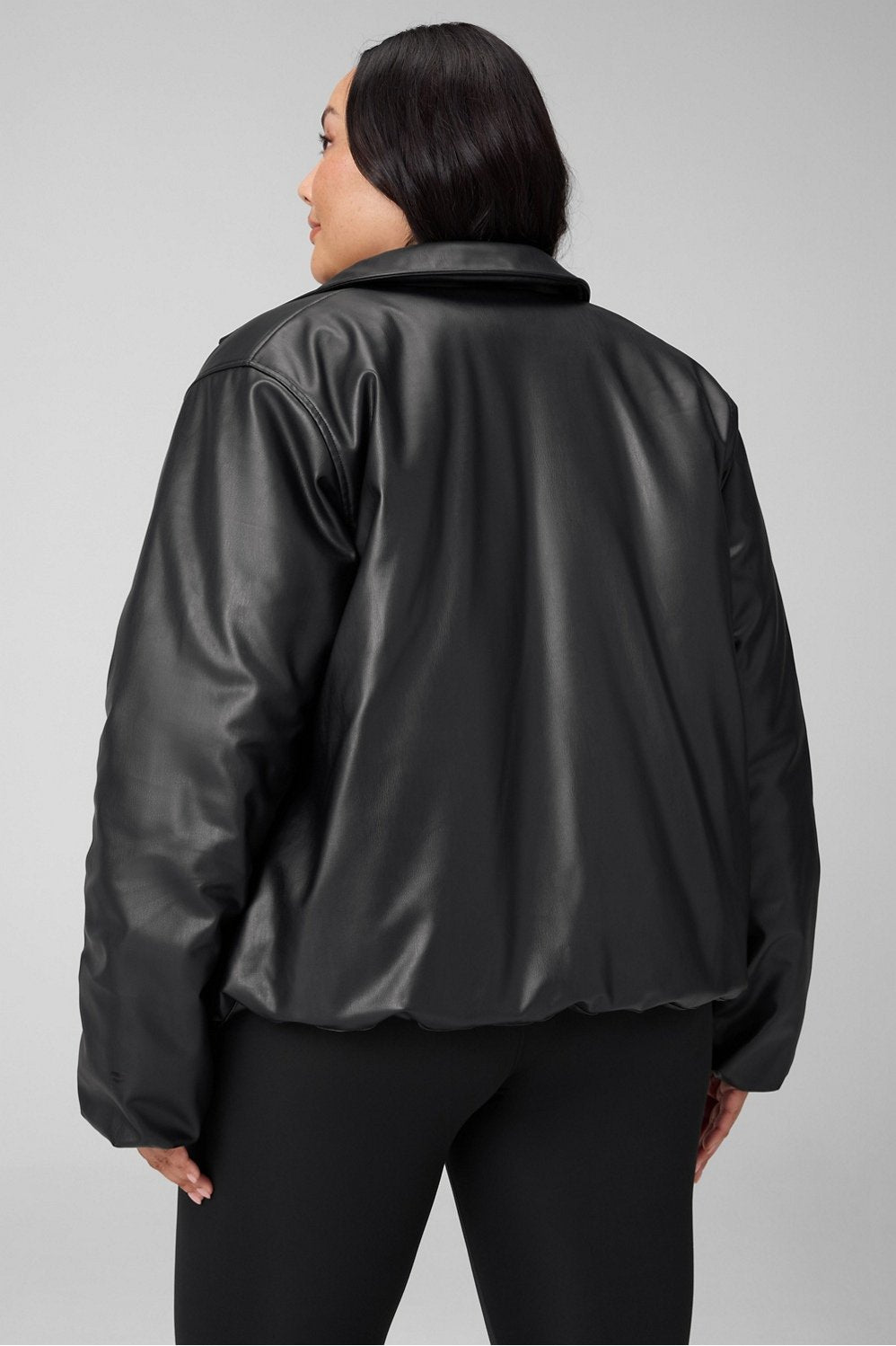 Effortlessly cool with just the right amount of edge. This faux leather padded bomber is your new throw-on-and-go layer for the colder seasons. The structured silhouette, collared neckline, and classic ribbed trim give it that timeless bomber feel, while the padded design adds warmth. A full zip closure and hidden bungee at the sides let you adjust the fit just how you like it. It's the jacket that makes any outfit instantly cooler.