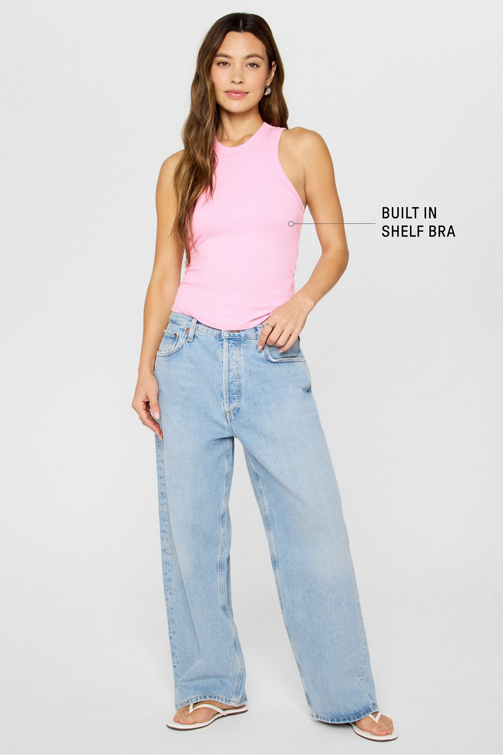 Dress it up or down. This slim-fitting tank is a must in every wardrobe. Ultra-soft cotton keeps you comfy, while the high-neck design, ribbed textured, and curved straps offer elevated everyday style.