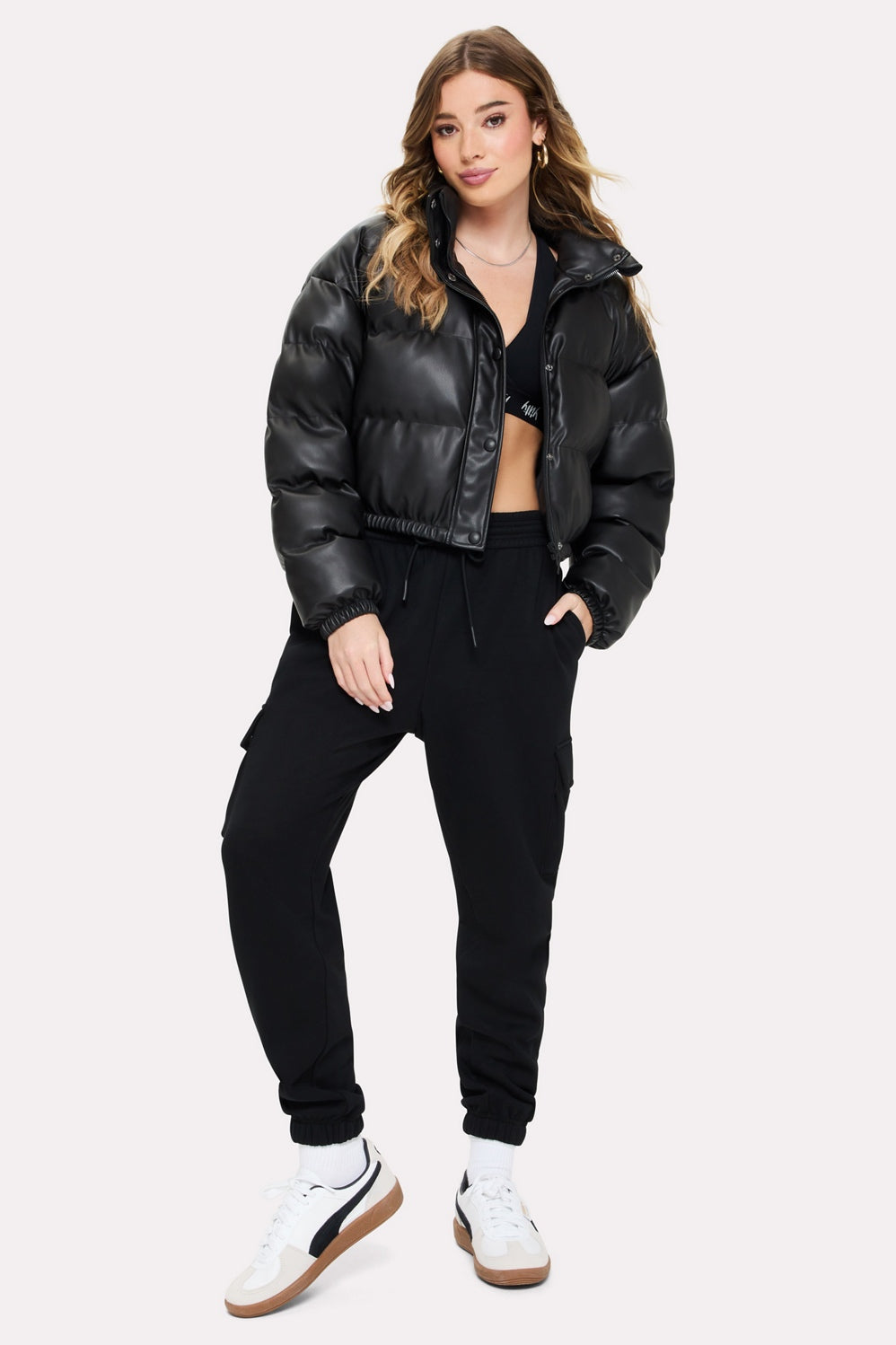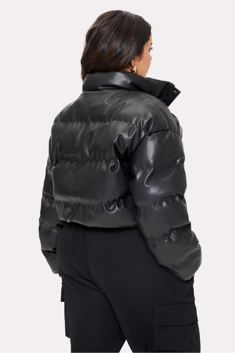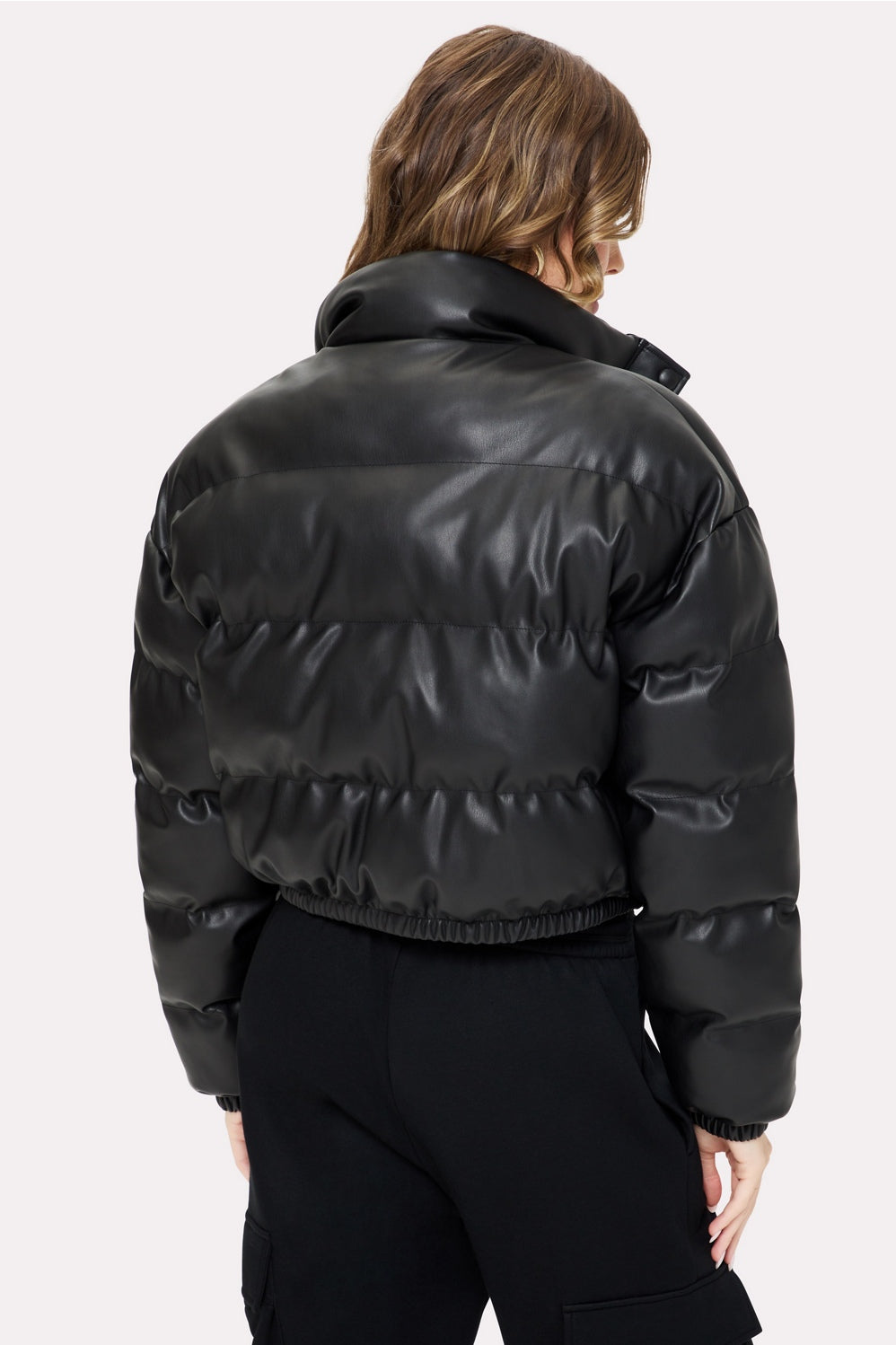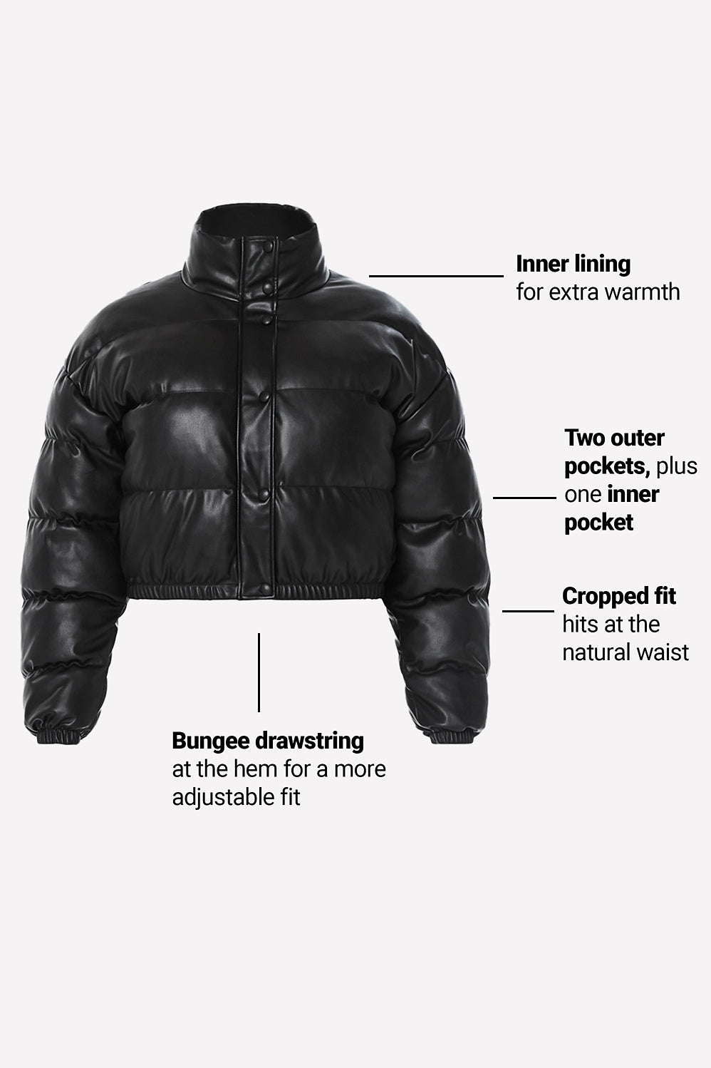 Take your outfit up a notch with this statement-making jacket. Its edgy design, made with faux leather, and cozy inner lining blend practicality with style, giving every outfit a bold upgrade. Cute, warm, and always ready to impress—this puffer has you co