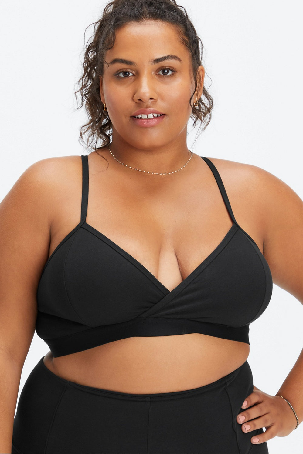Our lounge bralette with a cross-over front has a supportive racerback and thin spaghetti straps, making it a day-off staple.