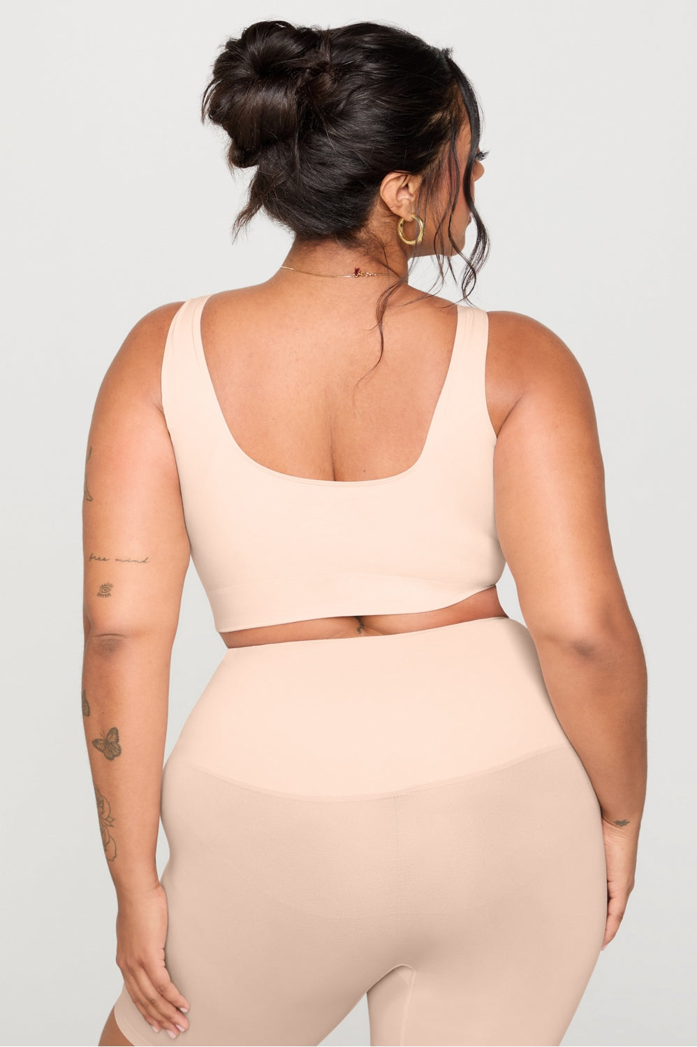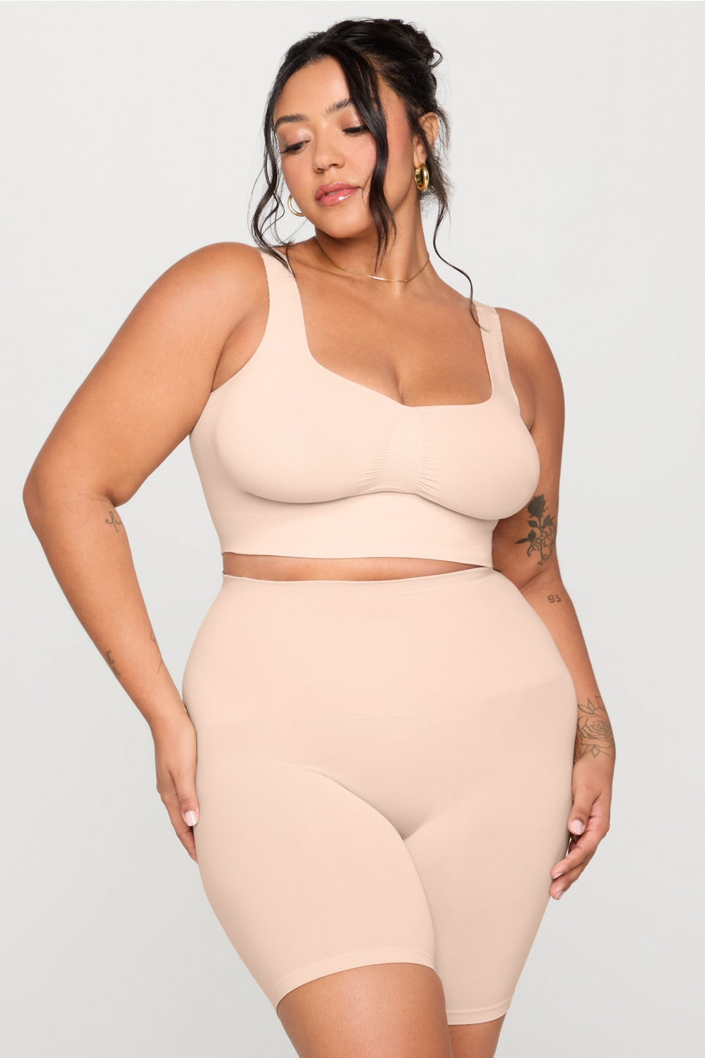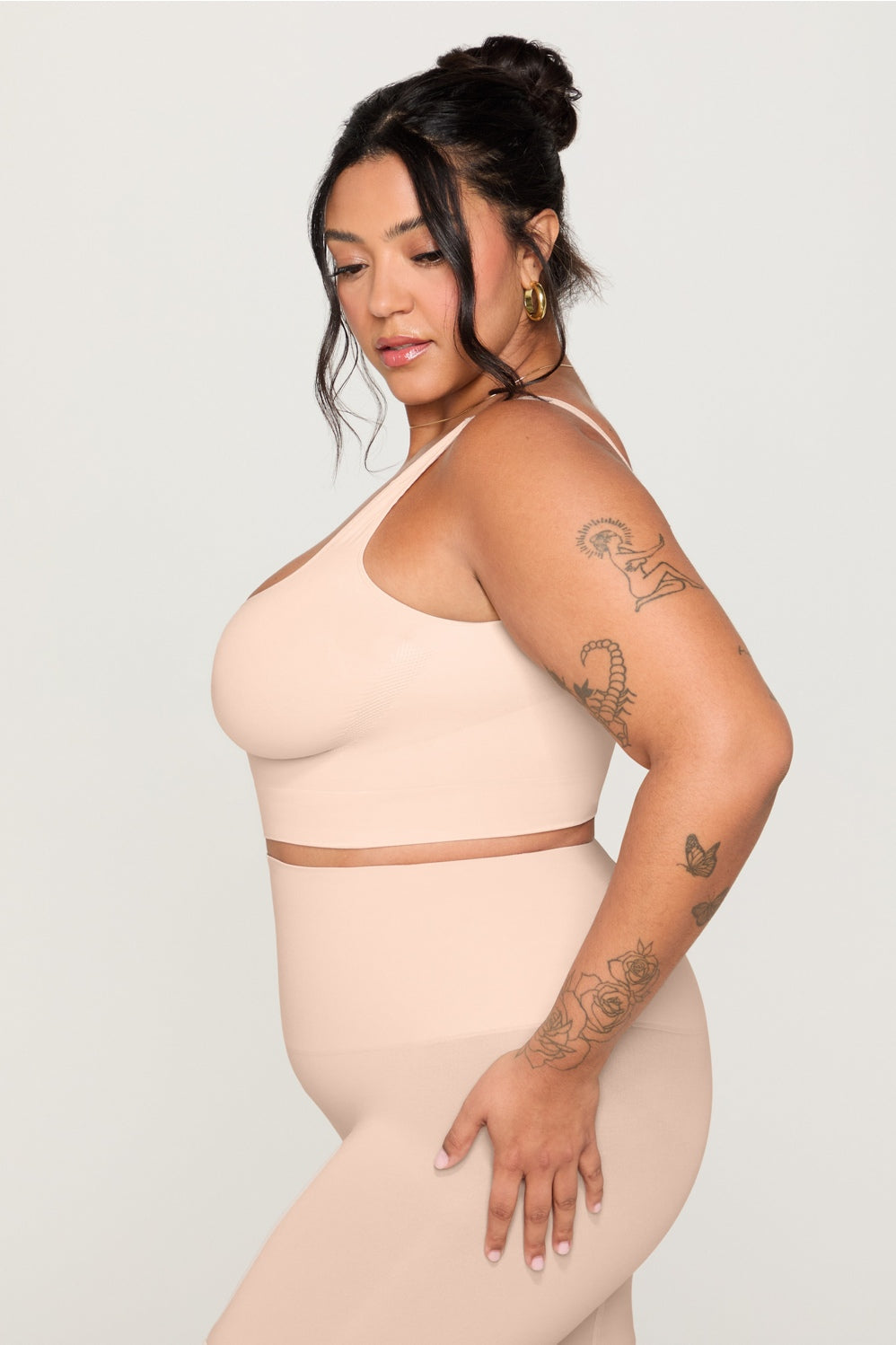 Our viral midi bra is made with seamless, 4-way stretch fabric, offering comfortable all-over compression and targeted zoning to define and support your bust. Thick straps stay put without digging in. Runs small. Size up for your best fit.