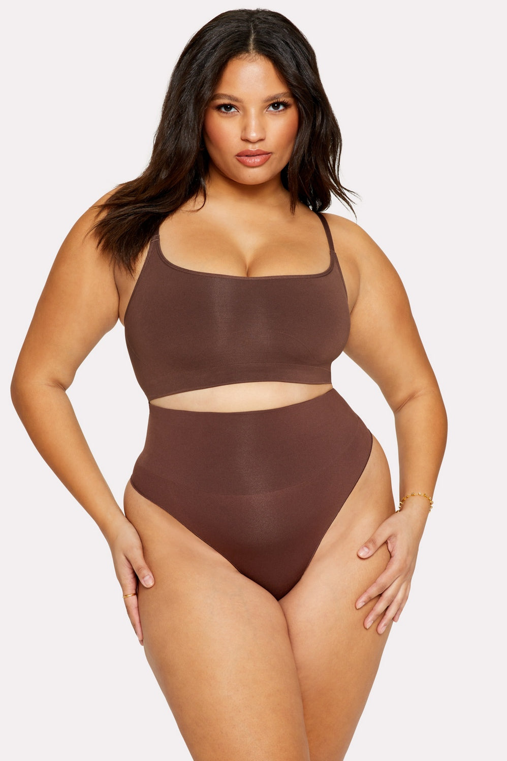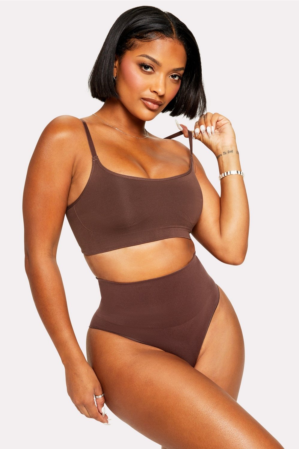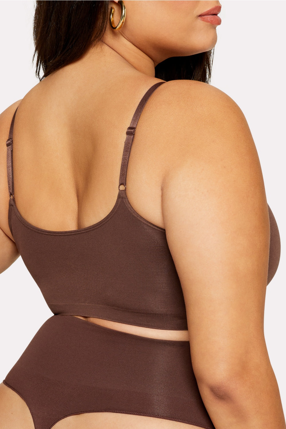 Designed for everyday wear, this seamless, double-layered bralette provides medium compression to support all cup sizes, with hidden anti-uniboob technology to give your bust definition. Runs small. Size up for your best fit.