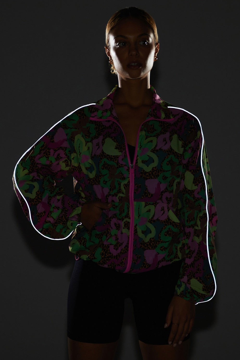 This cinchable, lightweight jacket has an oversized fit and features reflective piping.