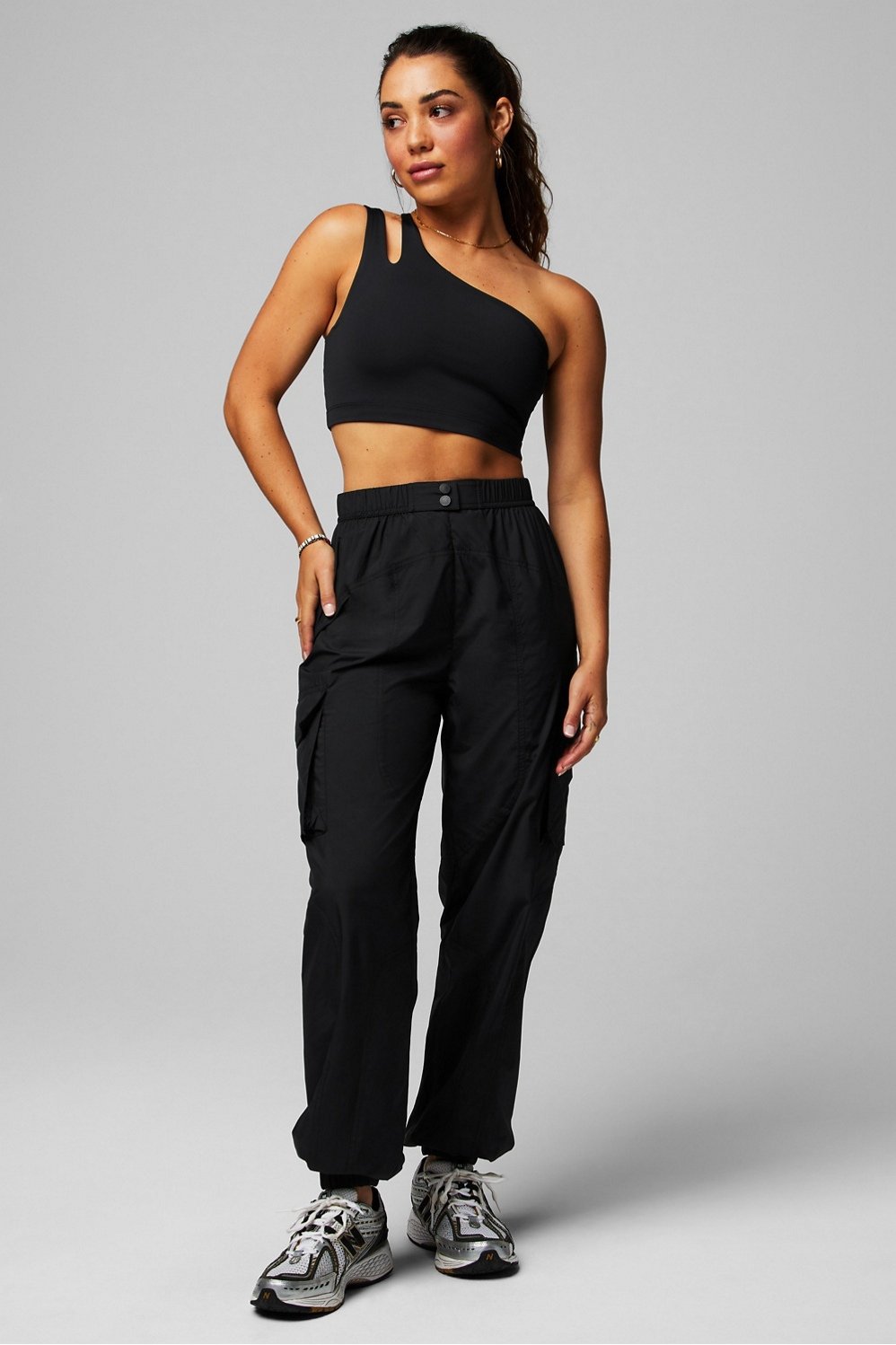 The perfect companion piece. These pants are designed to pair back with your favorite activewear styles — for an on-trend, on-the-go look. They feature cargo pockets, a faux snap open, and lightweight nylon fabric for year-round wear.