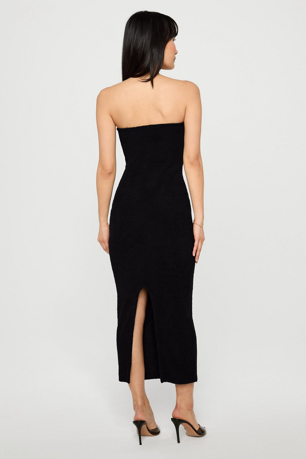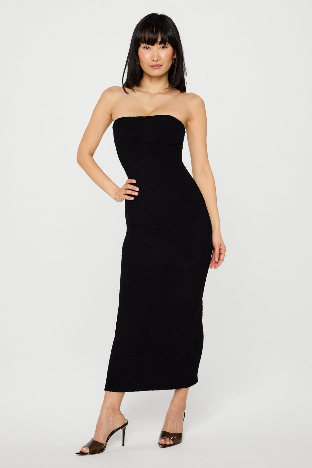 For your soft, sexy era. With a plush touch, this ultra-soft dress features a curve-hugging fit with an incredible drape. Details include an interior shelf bra, removable straps, and a sexy back slit for easy movement.