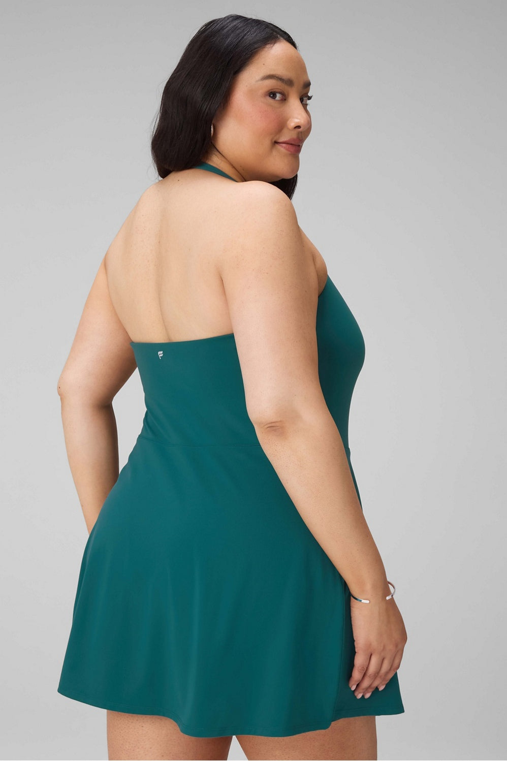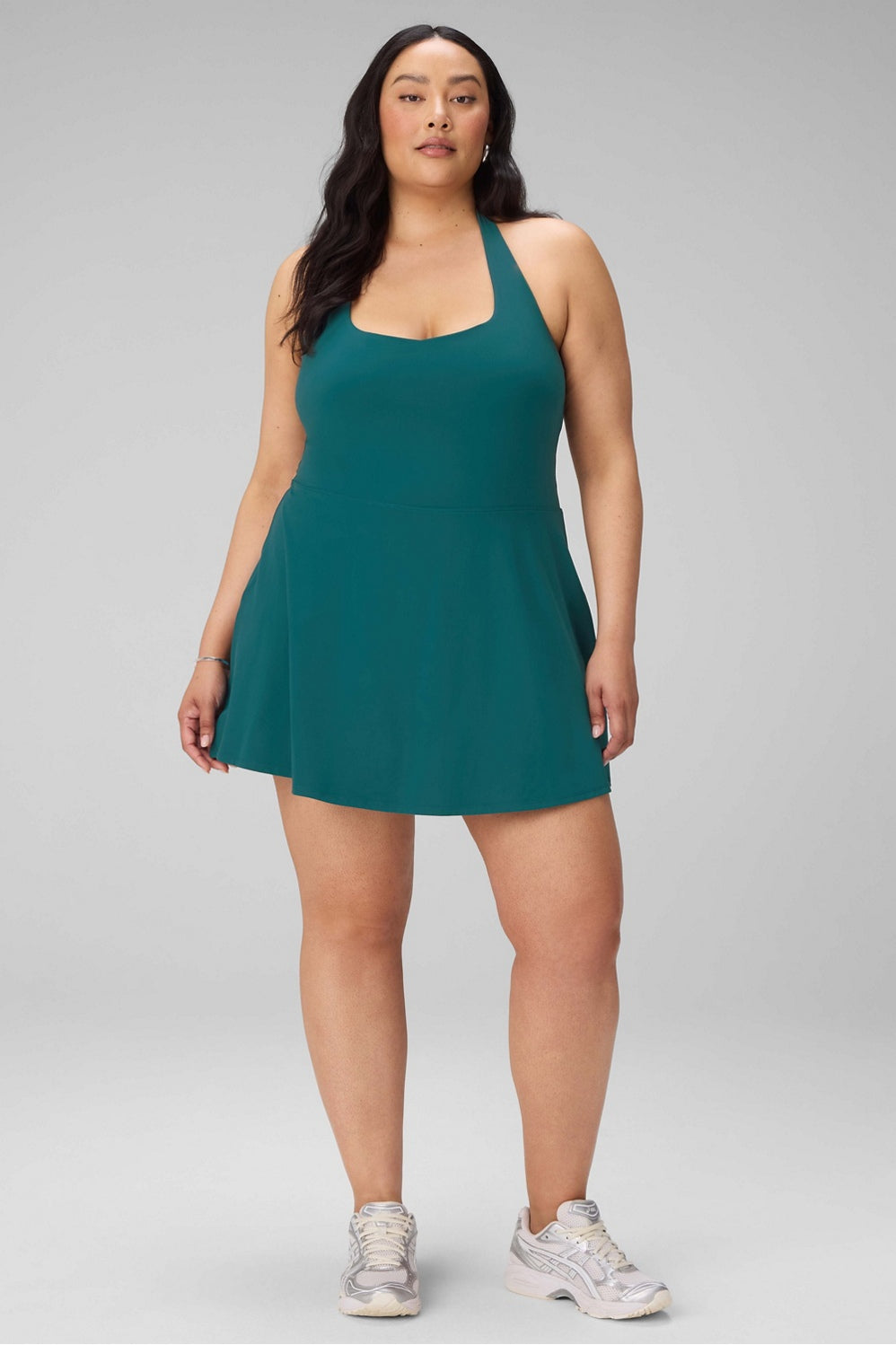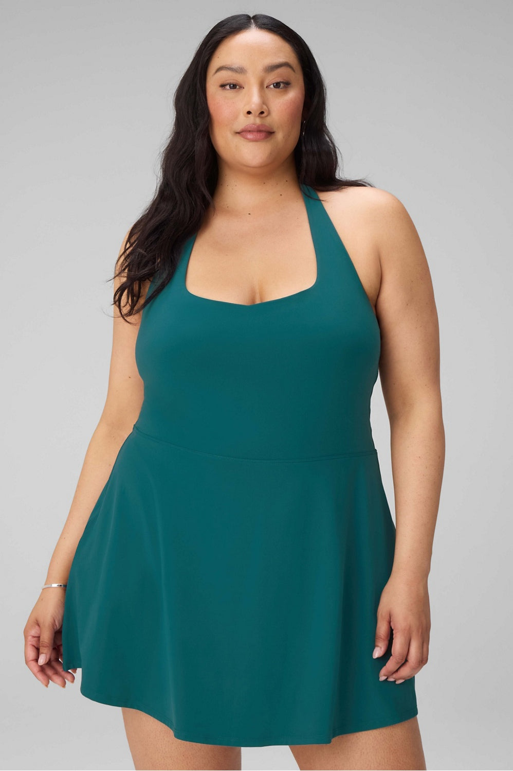 PureLuxe is back with a buttery-soft, flattering mini! With a halter neckline, figure-hugging fit, and mini hem, this dress is perfect for summer. It also features built-in shorts with pockets, a shelf bra with power mesh lining & removable cups, plus an adjustable swan hook closure.