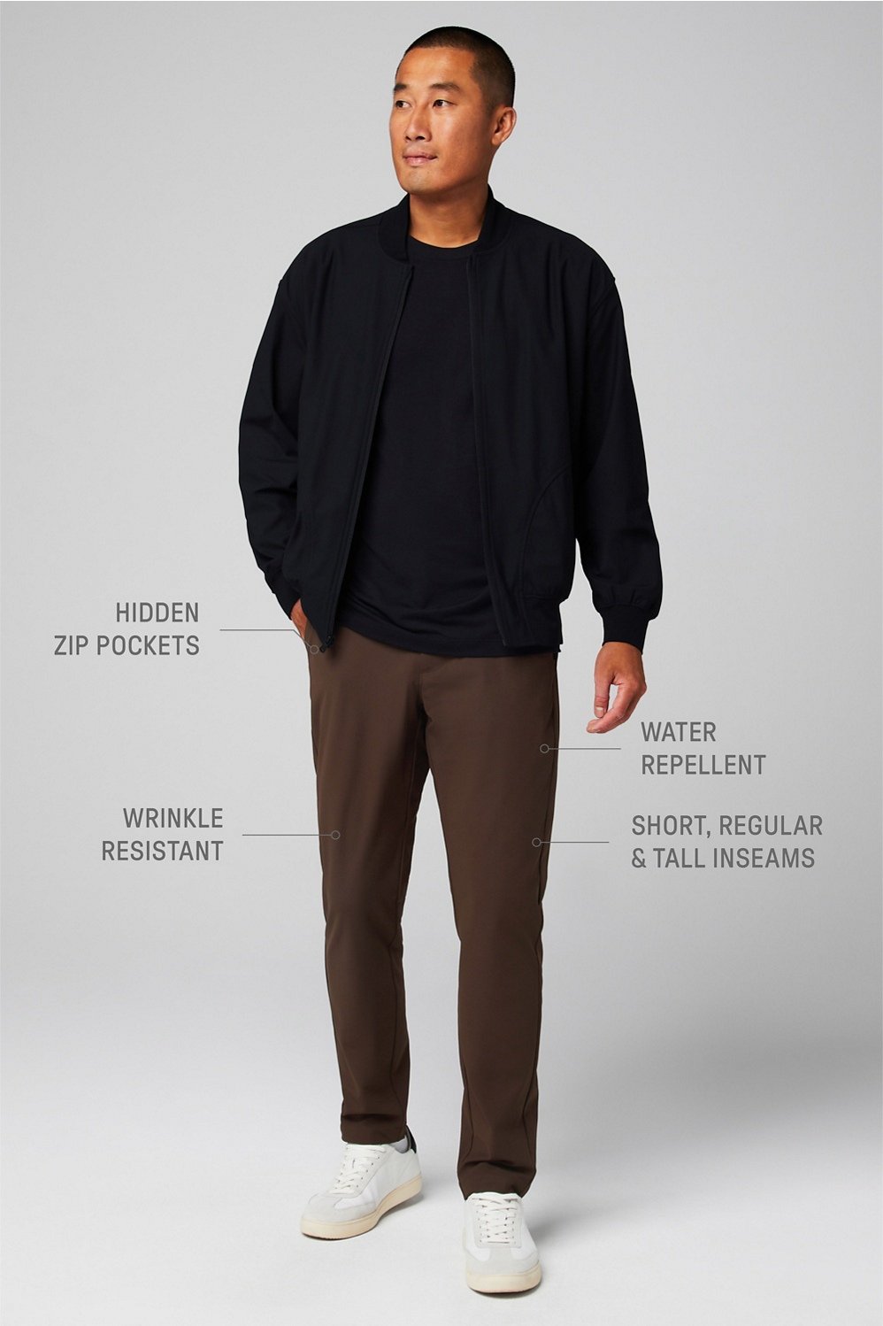 The ultimate grab-and-go fabric. Wrinkle resistant and water-repellent tech keep you looking polished while you’re on the go. Plus, breathable, 4-way stretch properties keep you cool and comfortable under pressure.