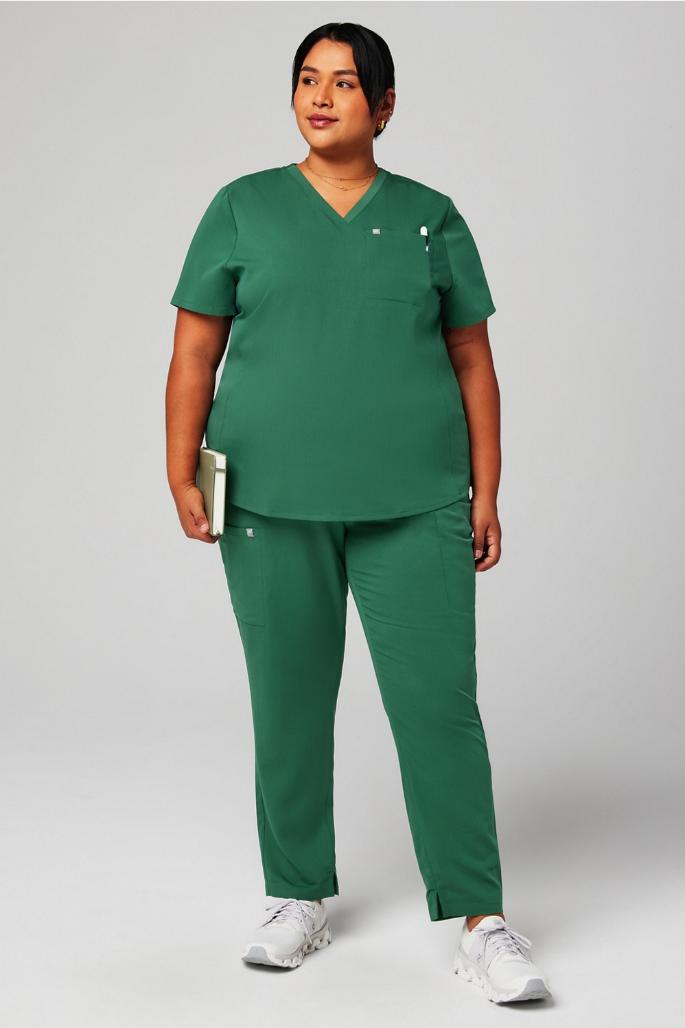 Made with superior stretch, durable water repellent tech, and a super-soft feel, this fabric is made to last & keep you comfortable through any shift. High-quality performance provides support and dependability, all while delivering a flattering finish.