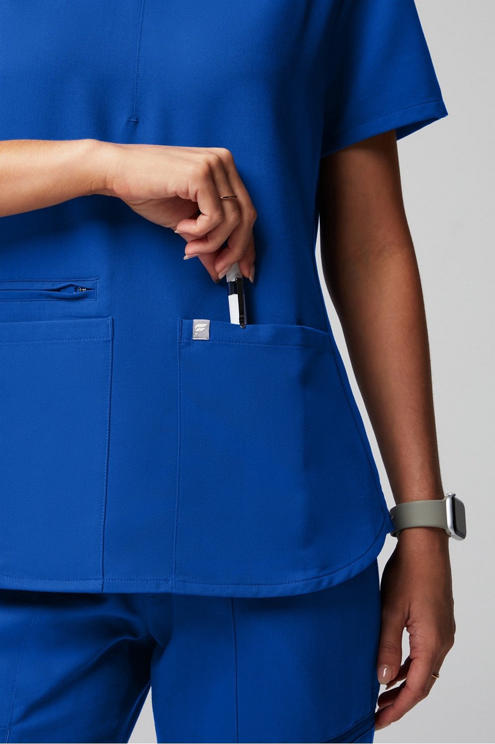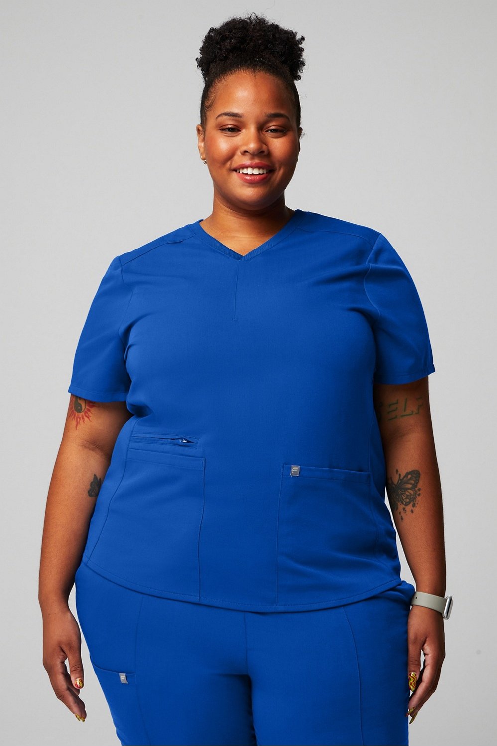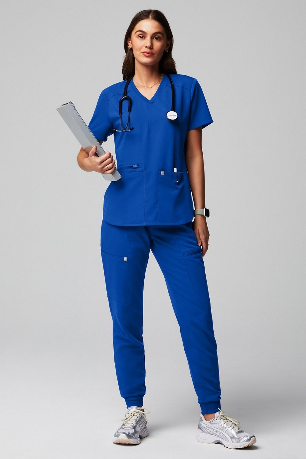 A functional update on our classic silhouette. Your new go-to scrub top has a semi-slim fit with four pockets and a bungee badge clip. Perfectly designed for 12-hour shifts and beyond.