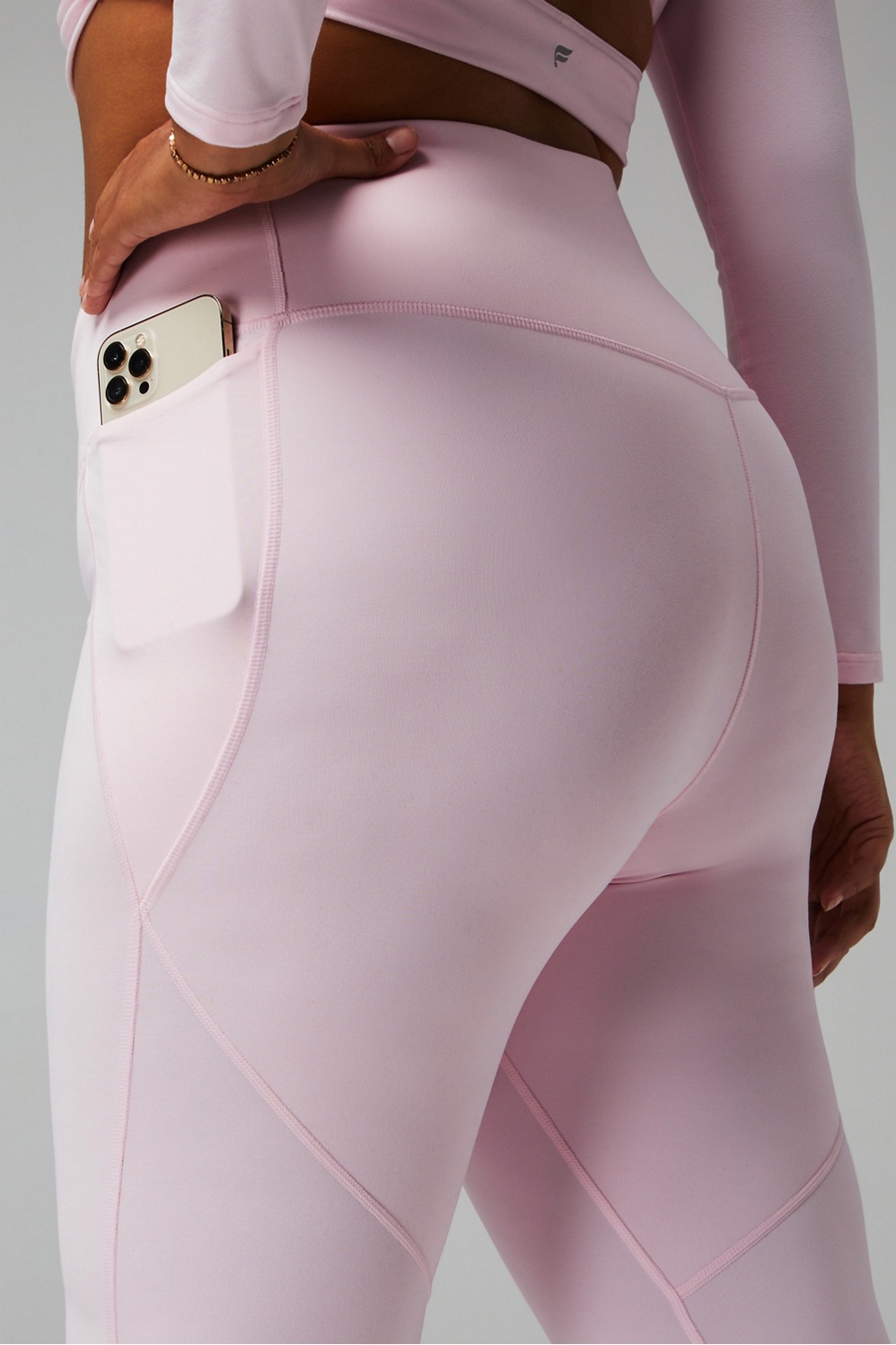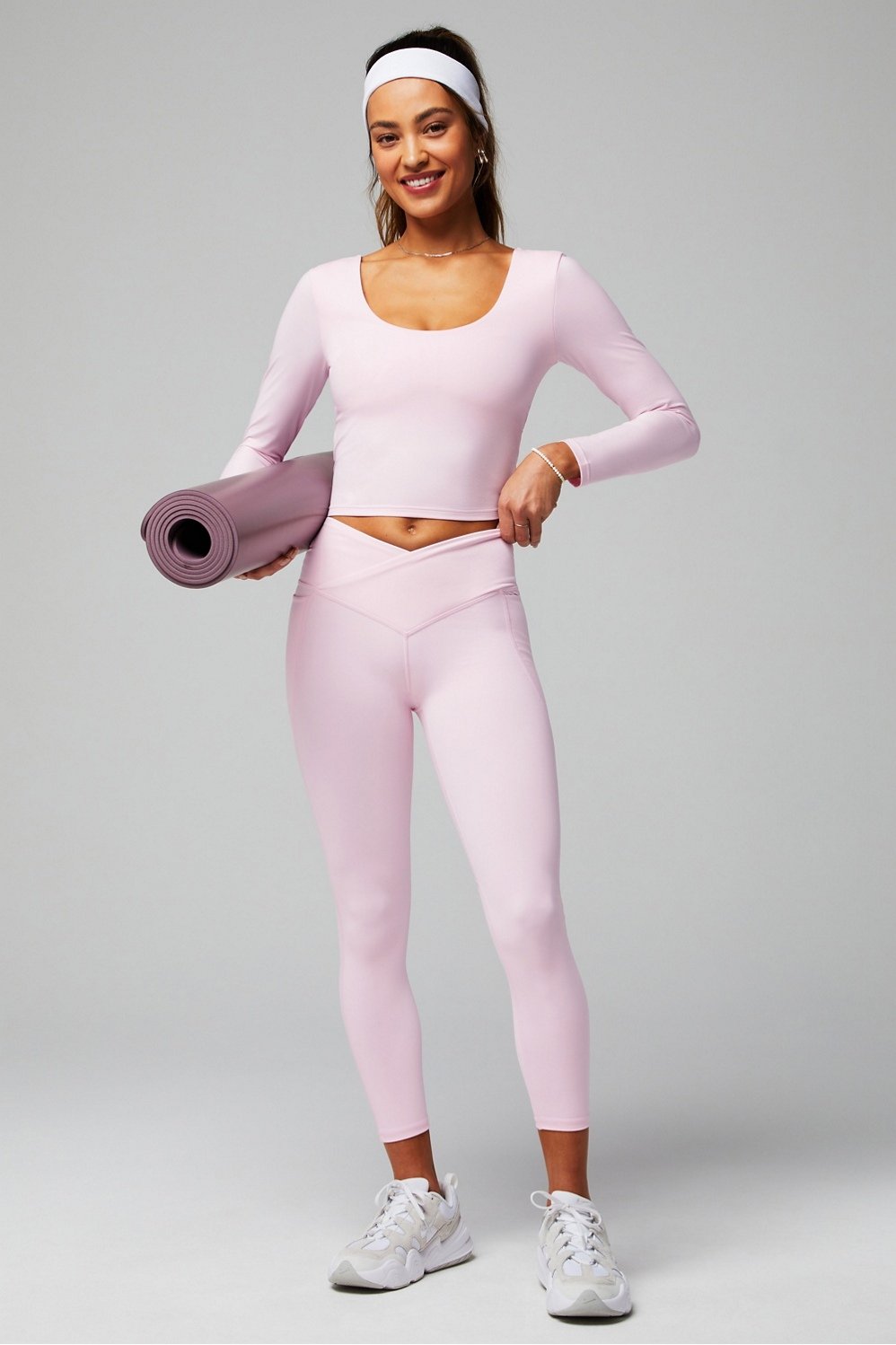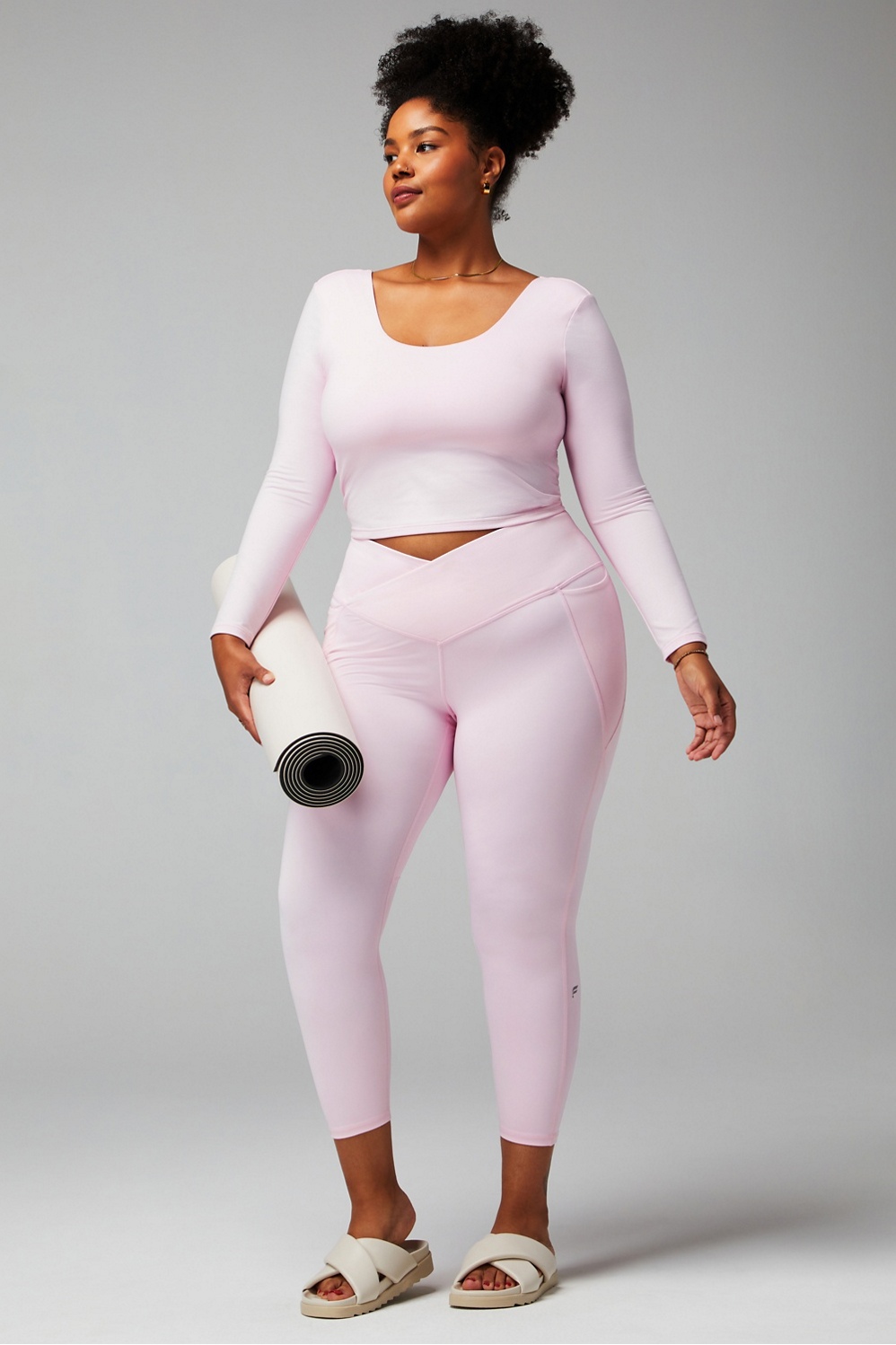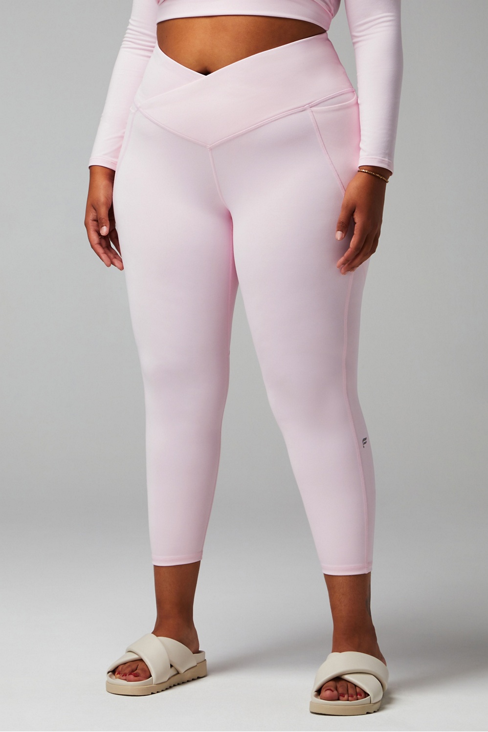 This high-waisted legging features a flattering crossover waistband and convenient pockets at the hips for maximum style and function.