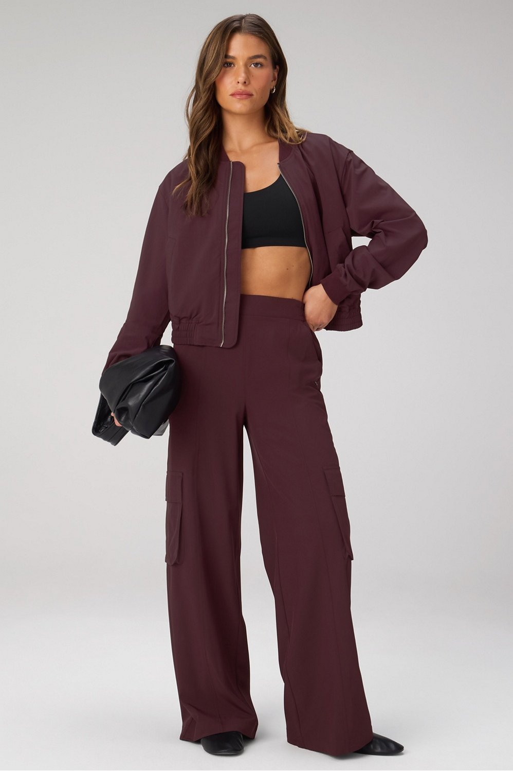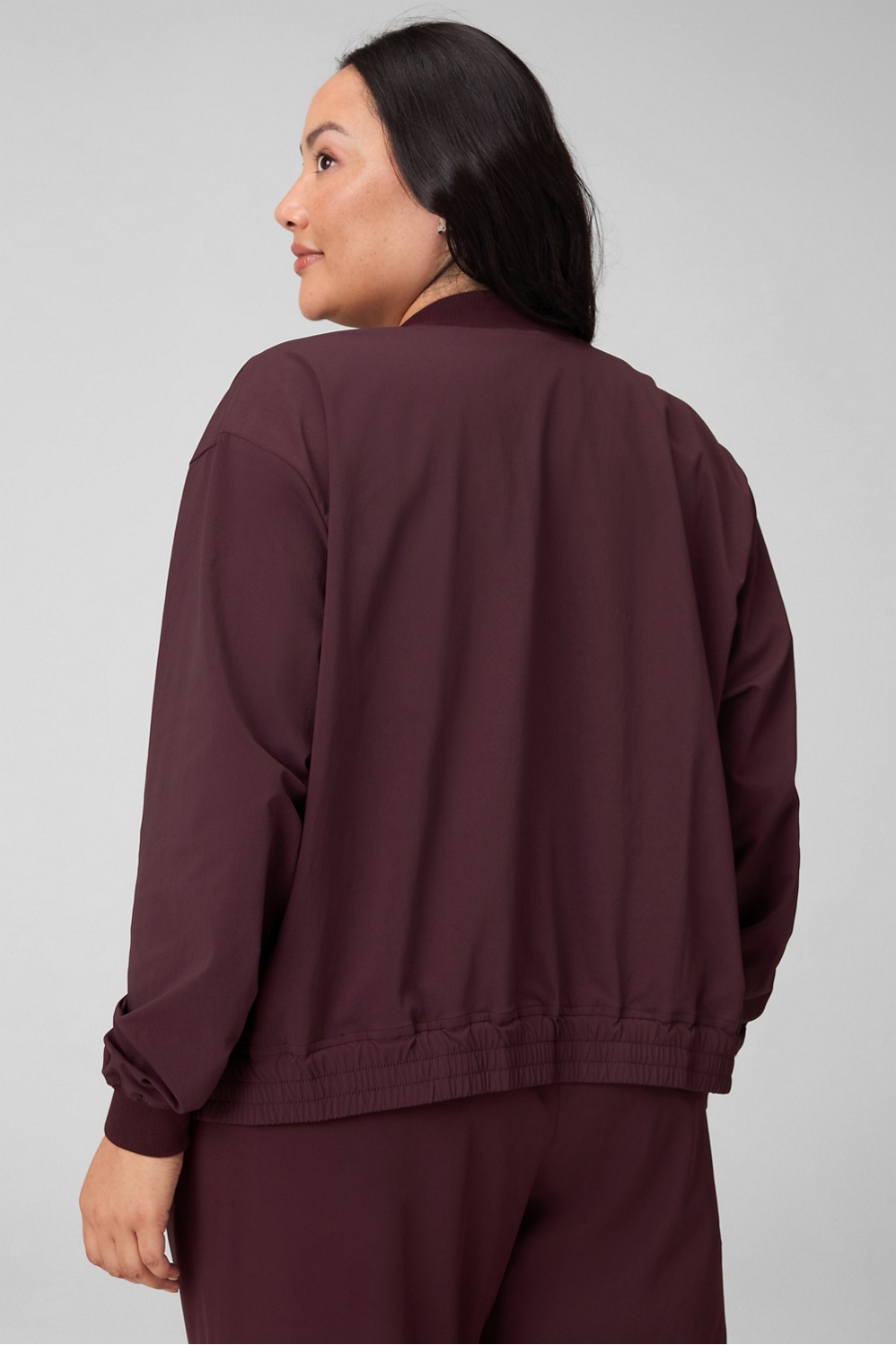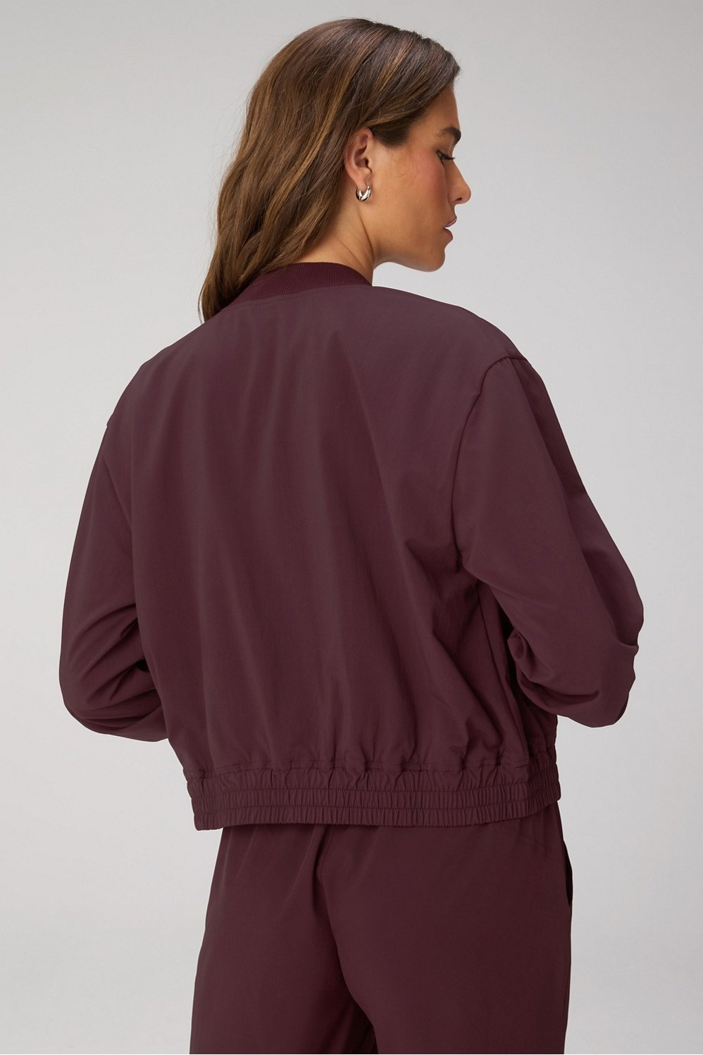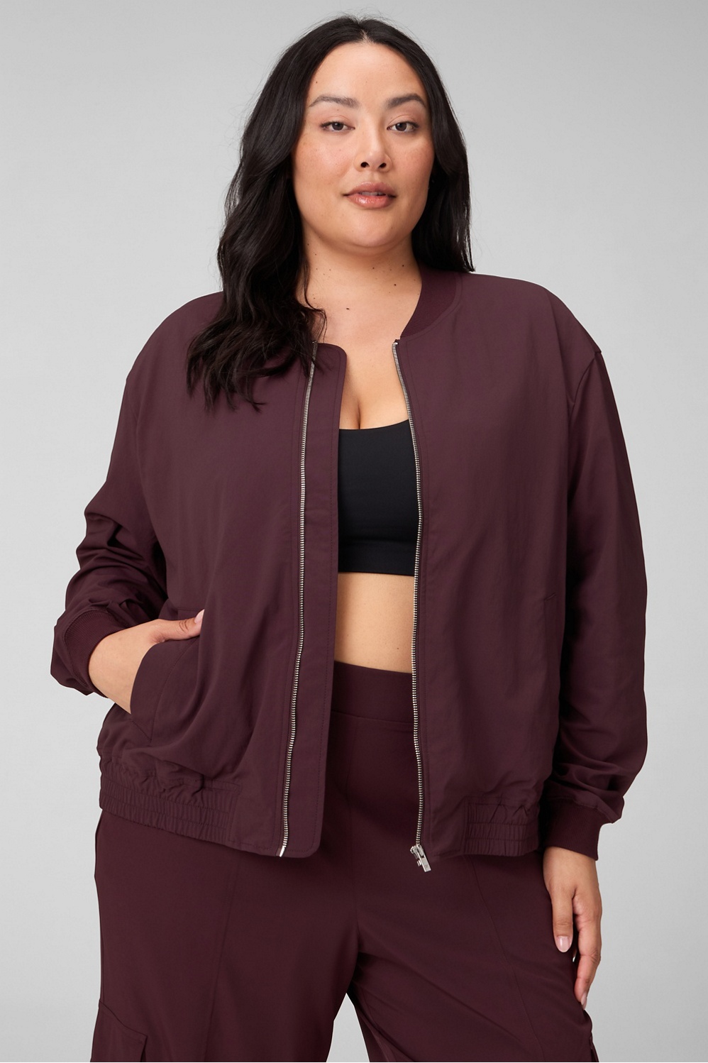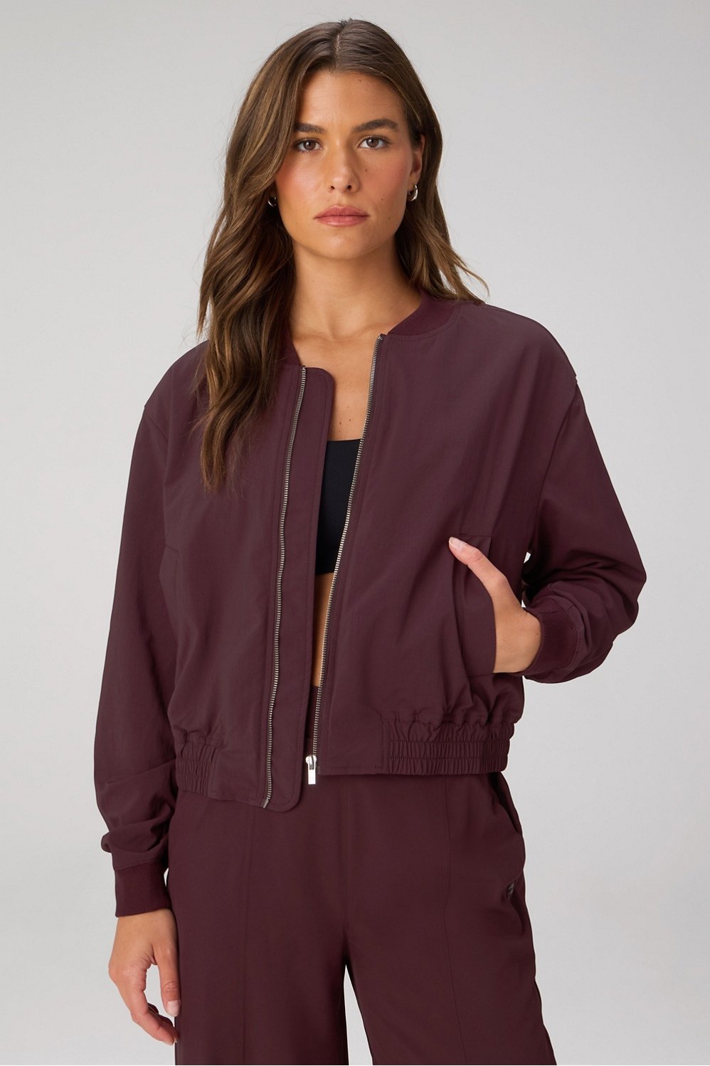 Throw on, show out. This bomber brings serious it-girl energy with its slight crinkle texture, ribbed trims, and wide angled pockets. The standard everyday fit makes it the perfect layer over your studio set, with style that goes way beyond the gym.