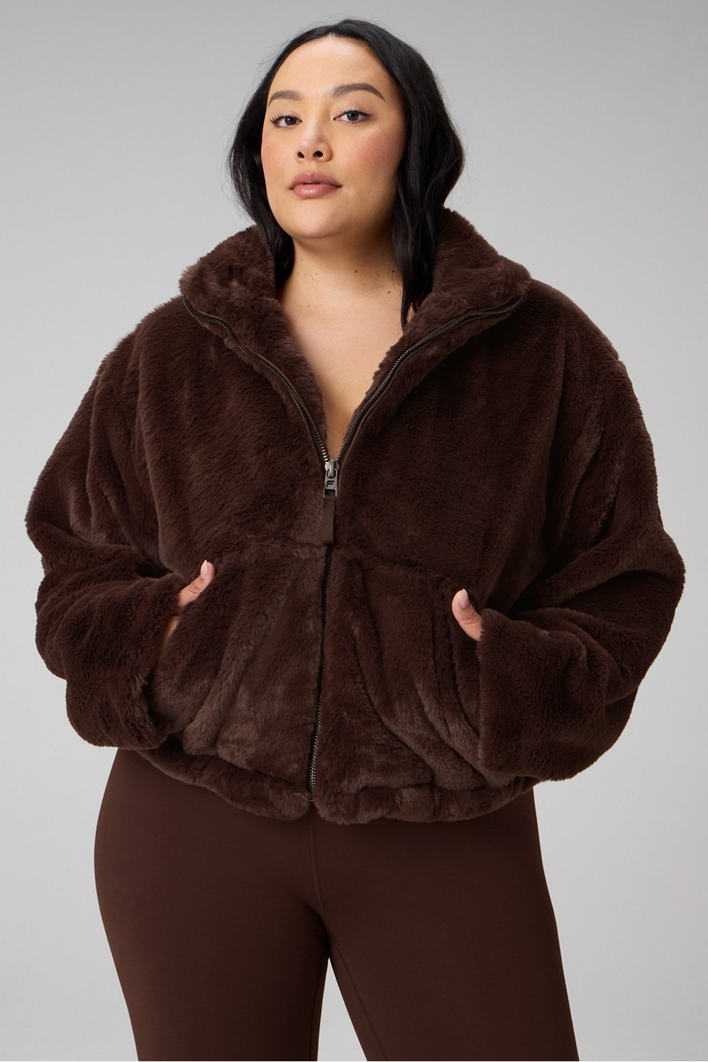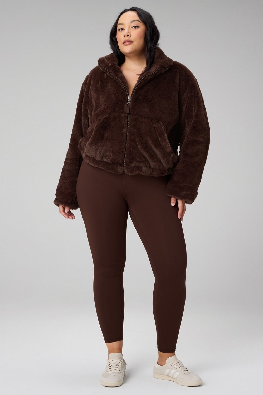 Fun, feminine, and ultra soft, this cropped faux fur jacket features a full zip and a bungee hem for a customizable fit. The plush texture and boxy shape add an elevated touch to everything from casual days to nights out.