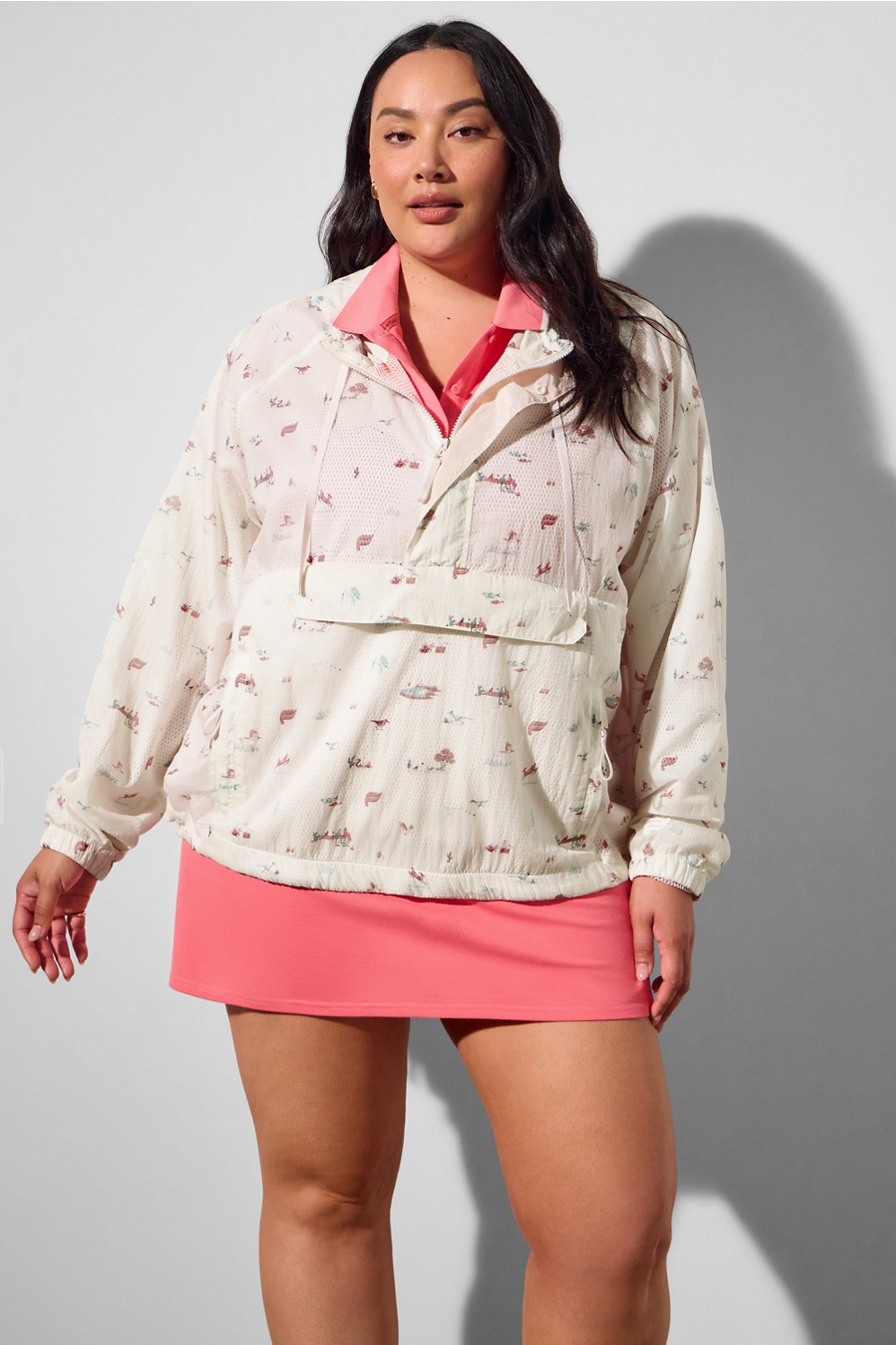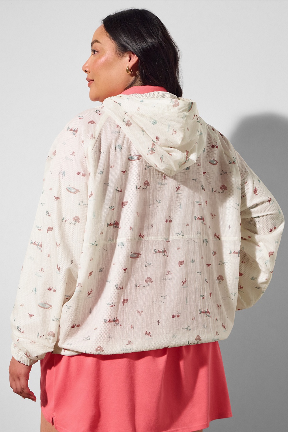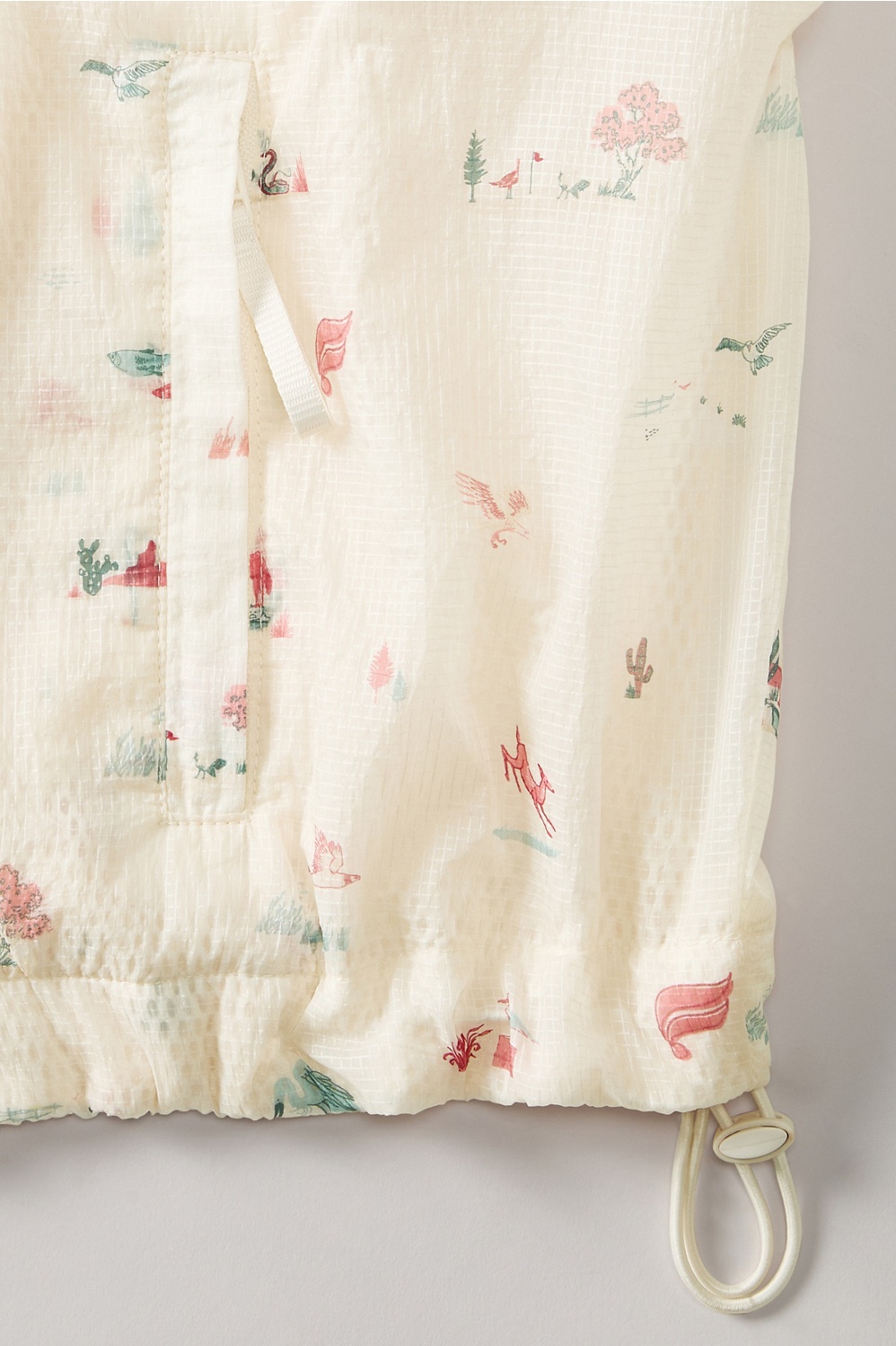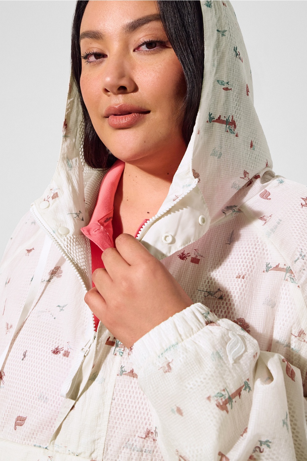 Malbon Golf co-creators Stephen & Erica Malbon bring their signature vision to an ultra-limited collection, exclusively for Fabletics.This jacket’s got all the vibes: an oversized fit, sheer textured ripstop fabric with open mesh lining, and a bungee hem so you can rock it cropped or cinched. Half-zip front, adjustable hood, zip pockets—yeah, she’s cute and practical. Finished with a signature embroidered animal patch and hand-drawn print inspired by the coastal, desert, and pine regions.