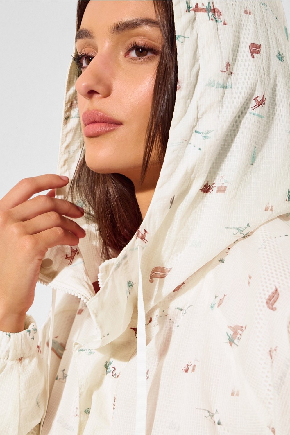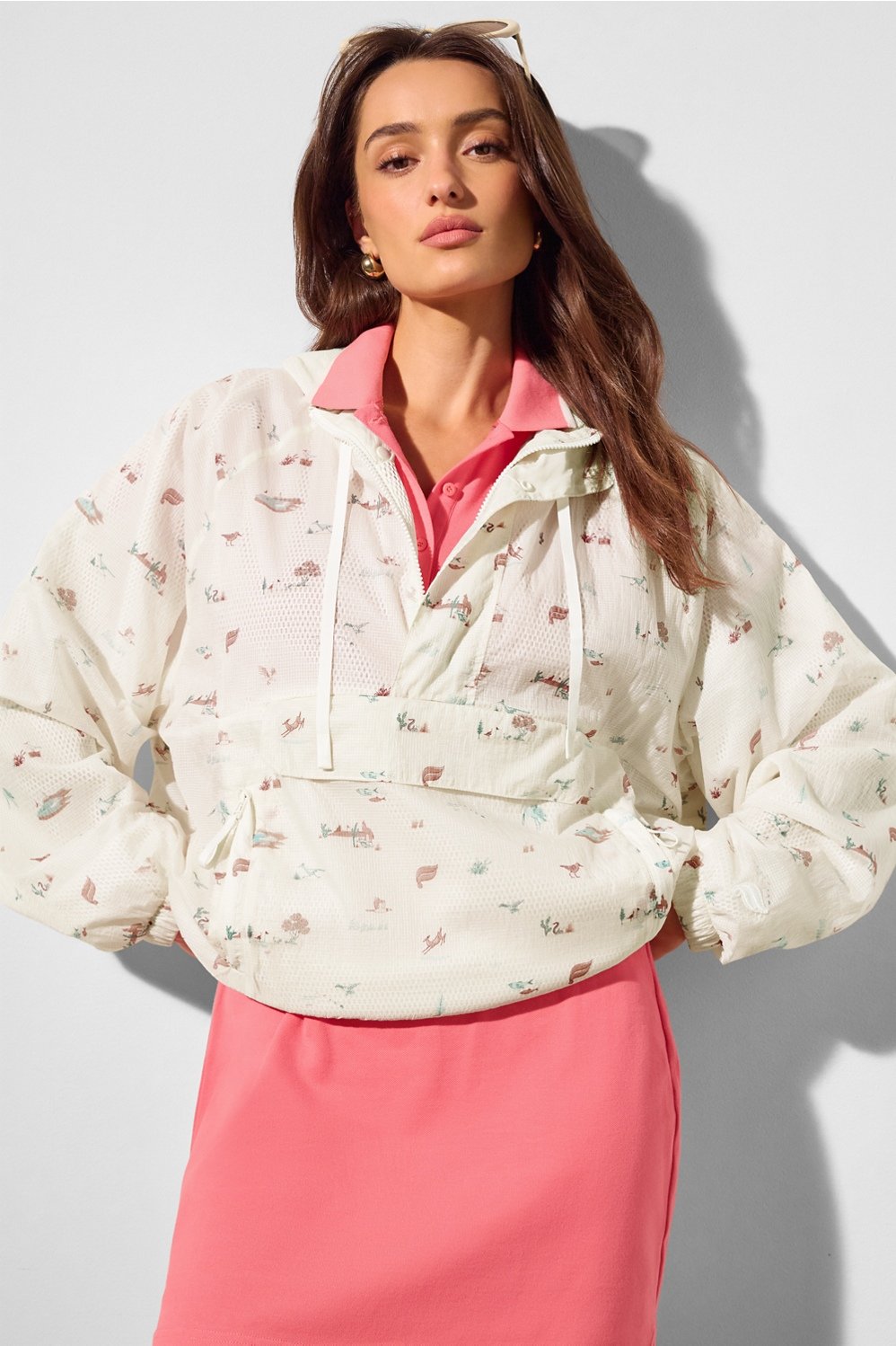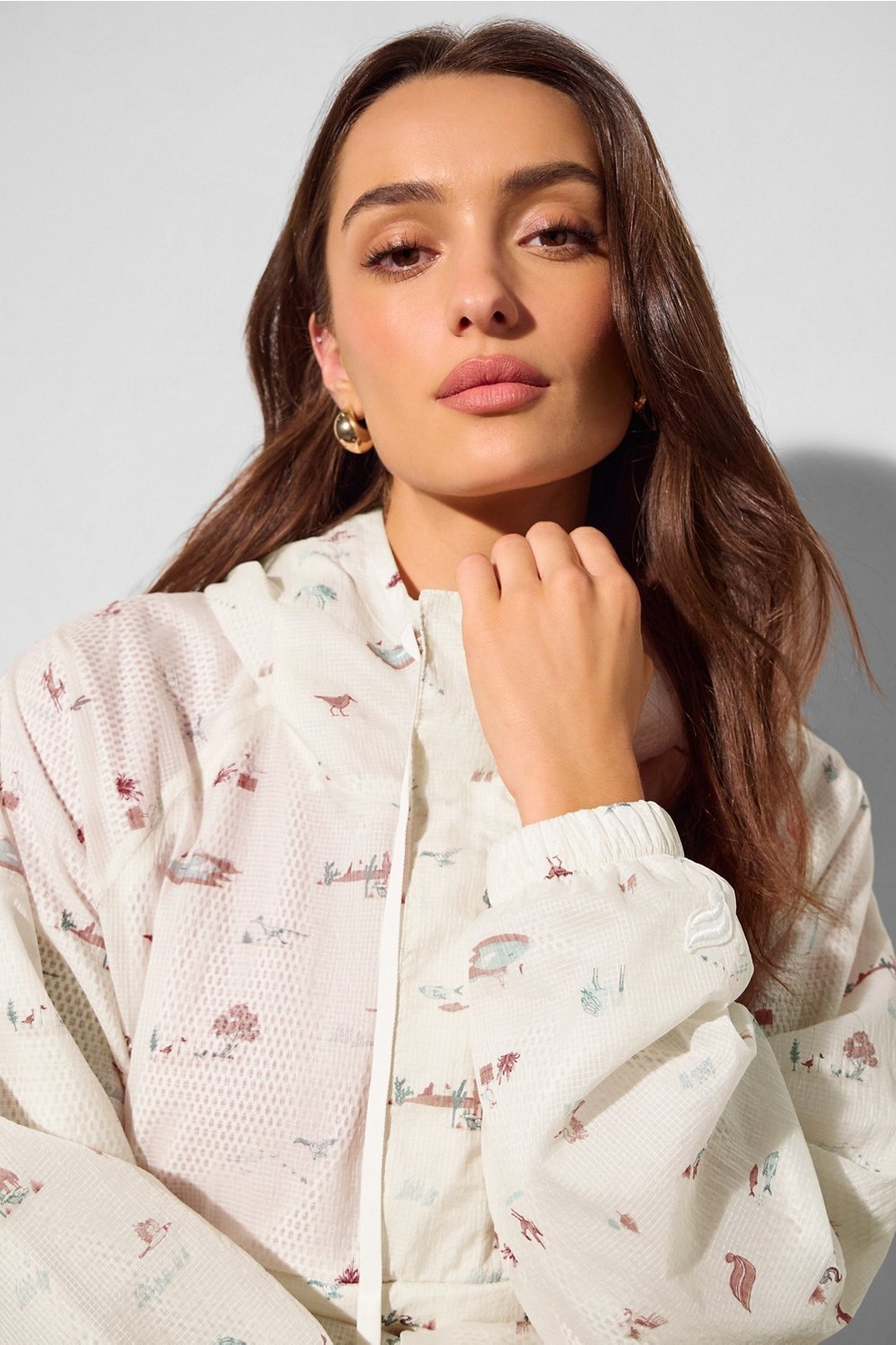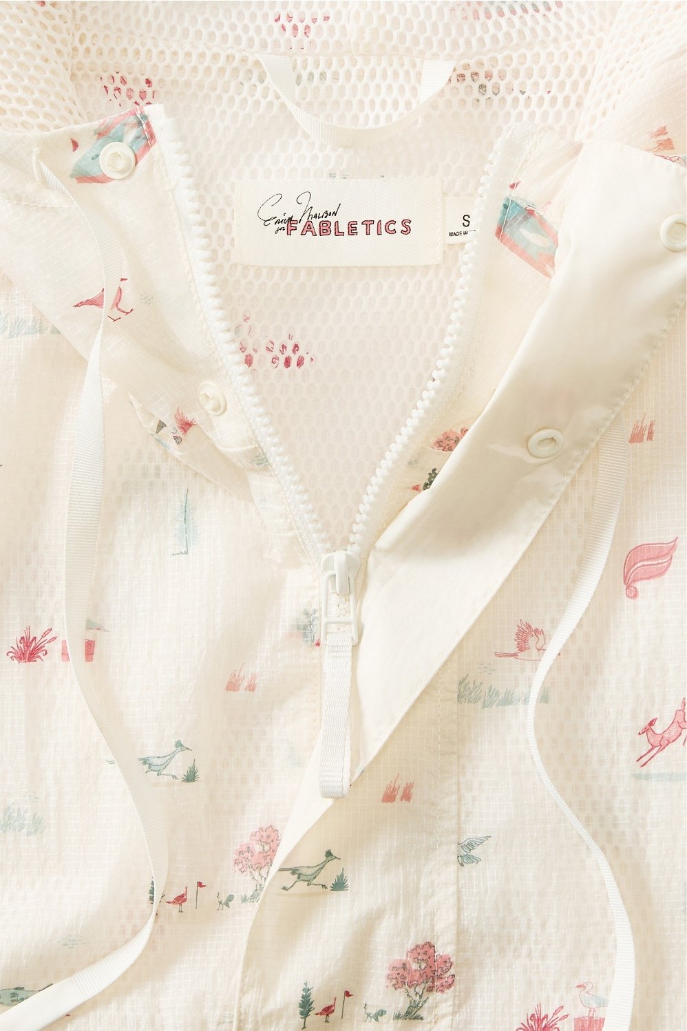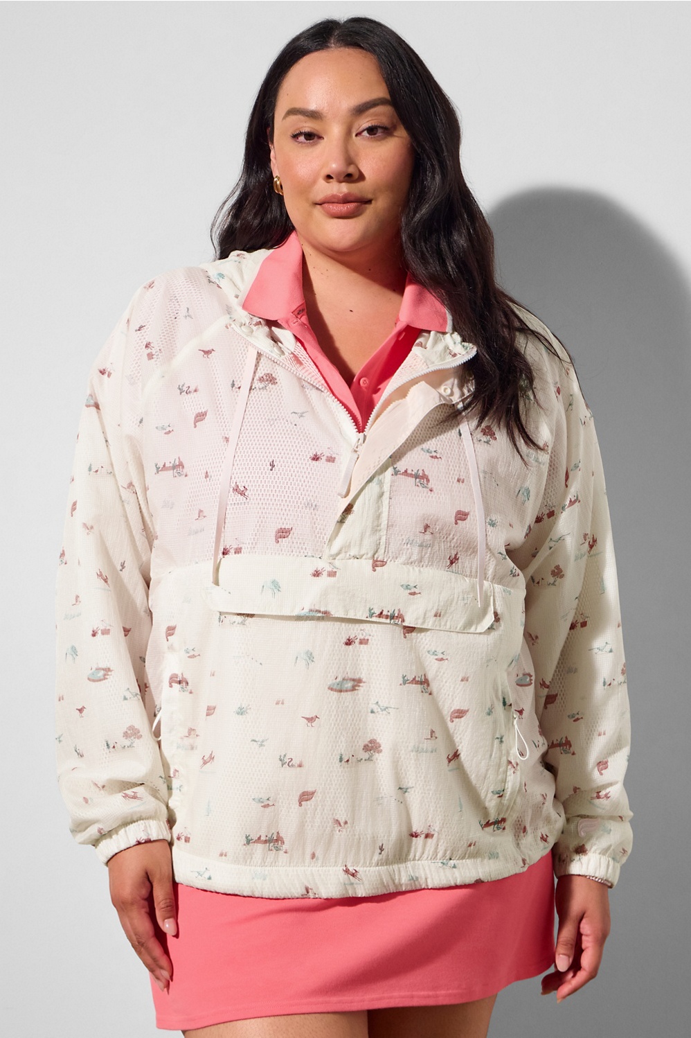 Malbon Golf co-creators Stephen & Erica Malbon bring their signature vision to an ultra-limited collection, exclusively for Fabletics.This jacket’s got all the vibes: an oversized fit, sheer textured ripstop fabric with open mesh lining, and a bungee hem so you can rock it cropped or cinched. Half-zip front, adjustable hood, zip pockets—yeah, she’s cute and practical. Finished with a signature embroidered animal patch and hand-drawn print inspired by the coastal, desert, and pine regions.