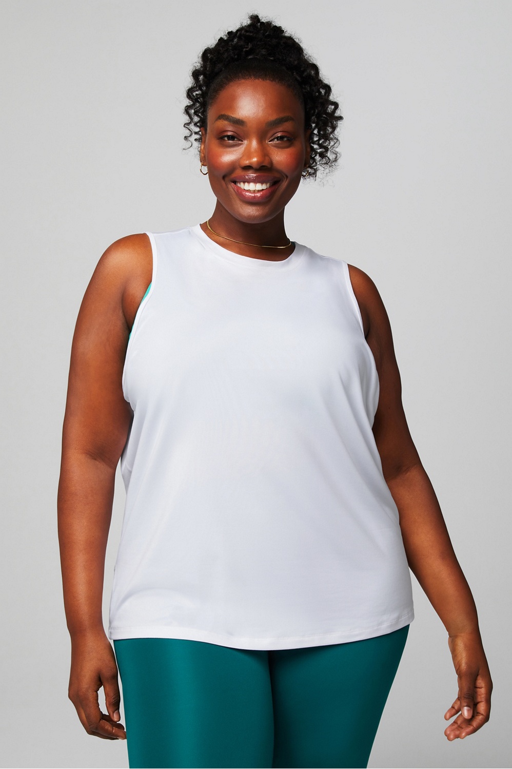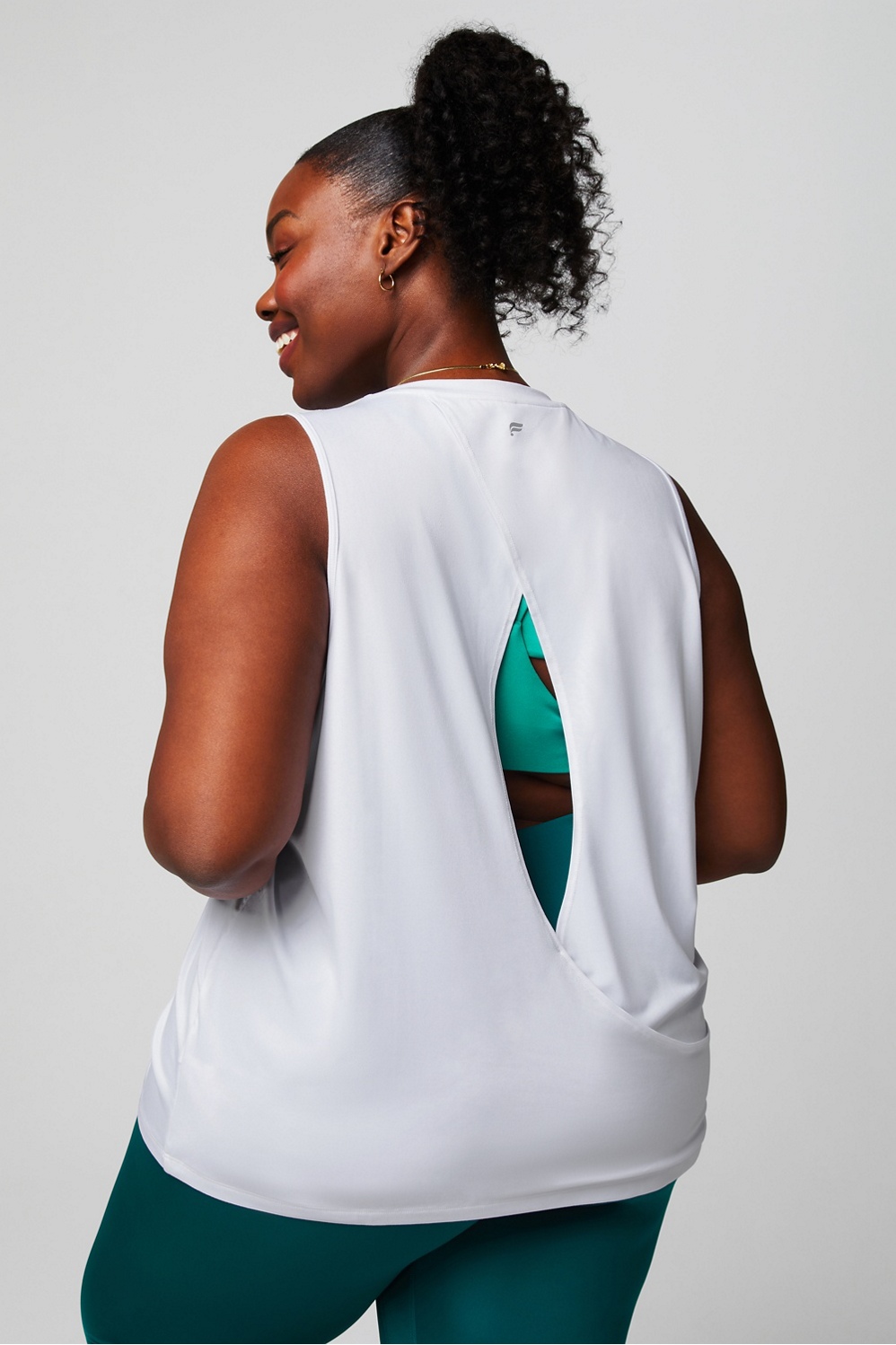 This super-soft tank with open back detail is made from recycled fabrics and will wick away moisture without feeling clingy in your next workout.