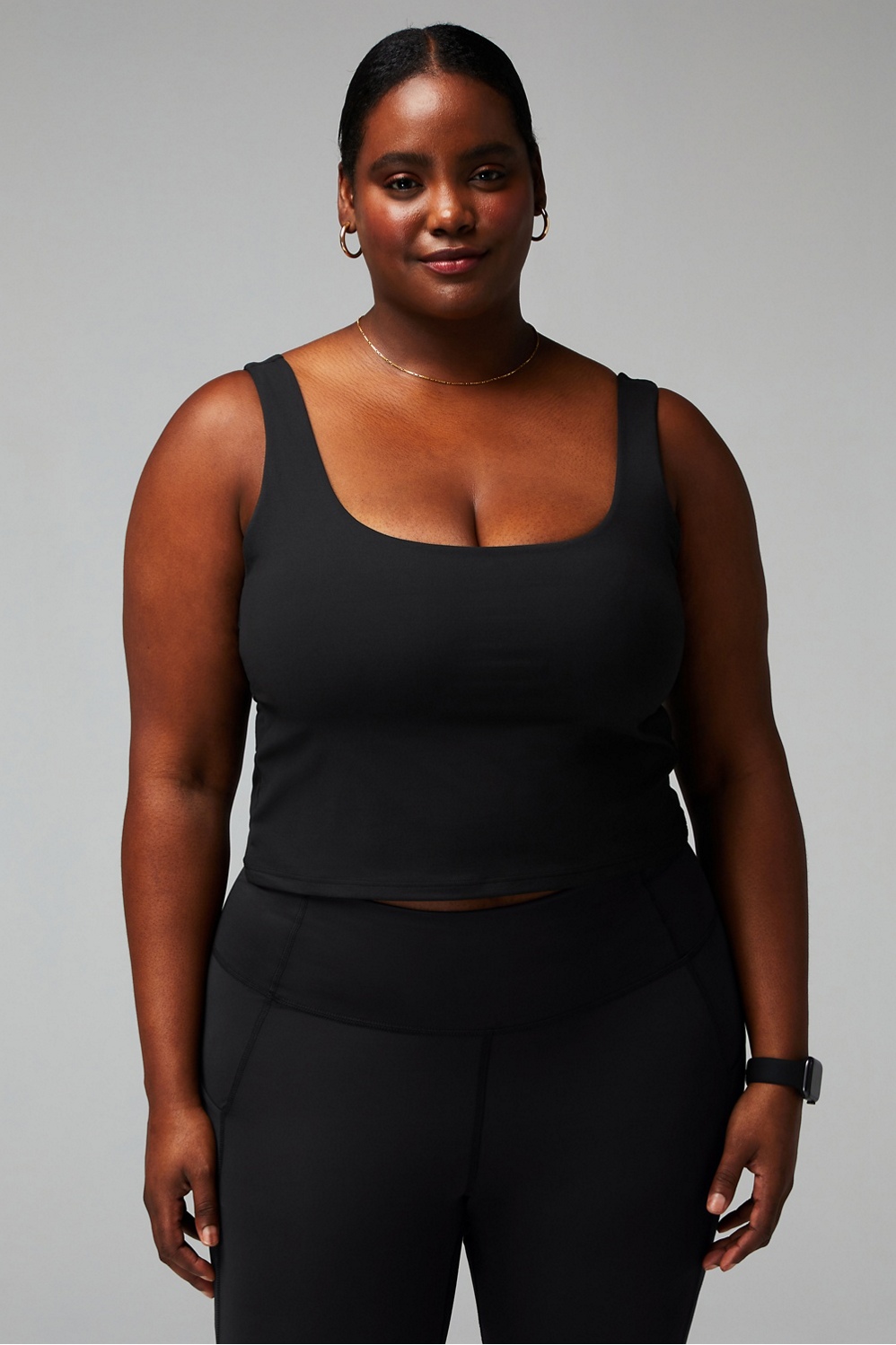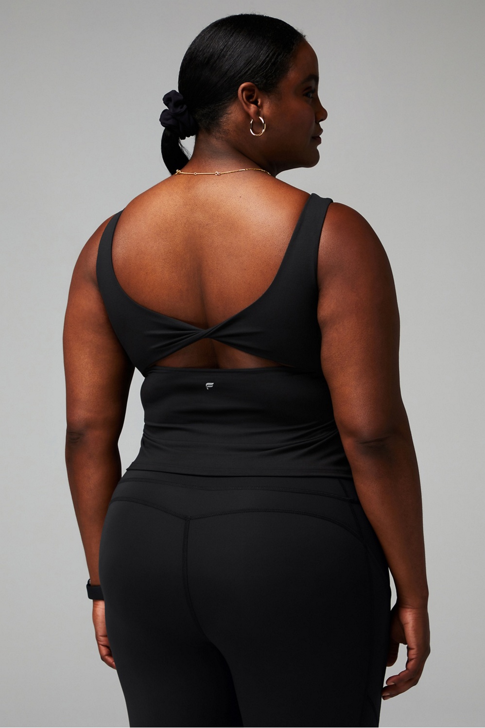 Our wide-strap tank cut from recycled fabric features a stylish twist detail at back and a comfortable (and convenient!) built-in bra.
