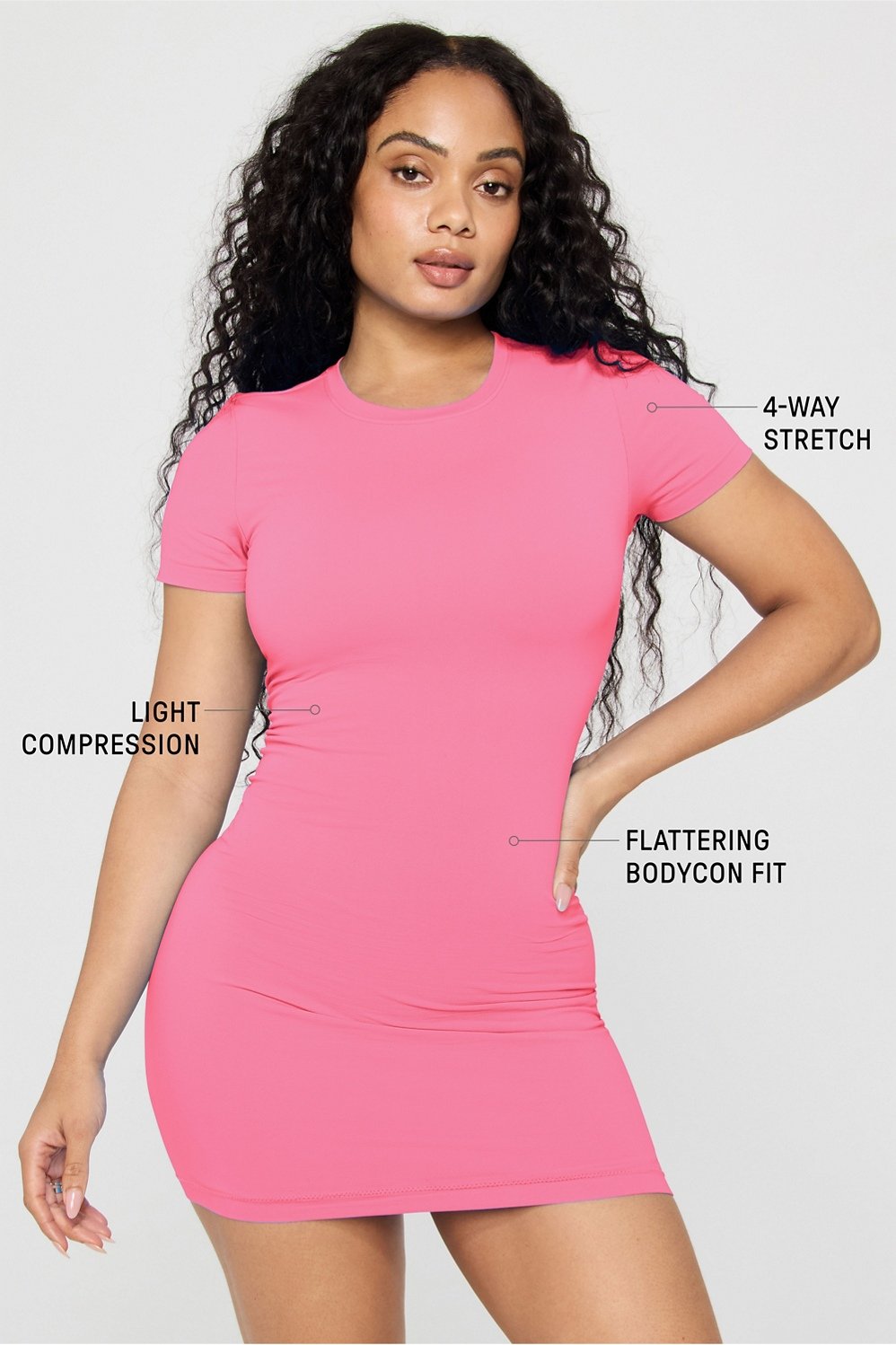 A no-brainer. This effortlessly chic dress hugs your curves in ultra-soft, seamless fabric from day to night. The bodycon fit flatters, the mini length hits above the knee, and the moisture-wicking, lightly compressive design keeps you comfy all day babe.