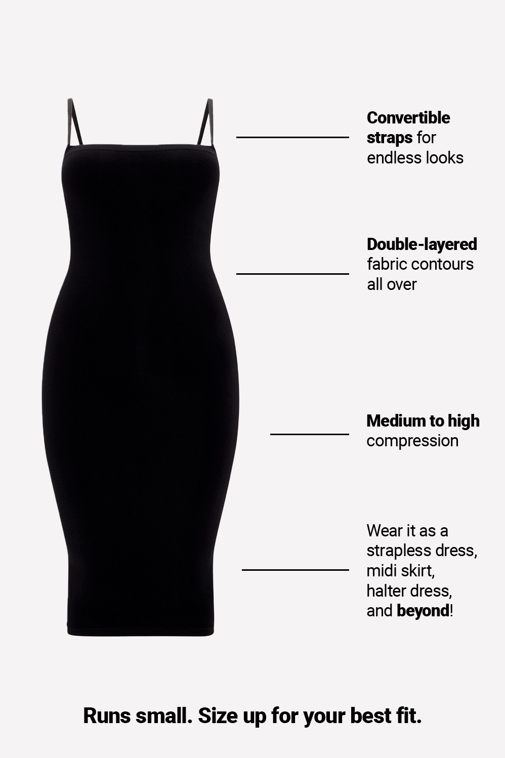 The most versatile piece, it’s a midi dress, mini dress, midi skirt, knee-length skirt, and a mini skirt all in one! Featuring double-layered fabric that smooths all-over plus convertible straps for endless looks. Runs small. Size up for your best fit.