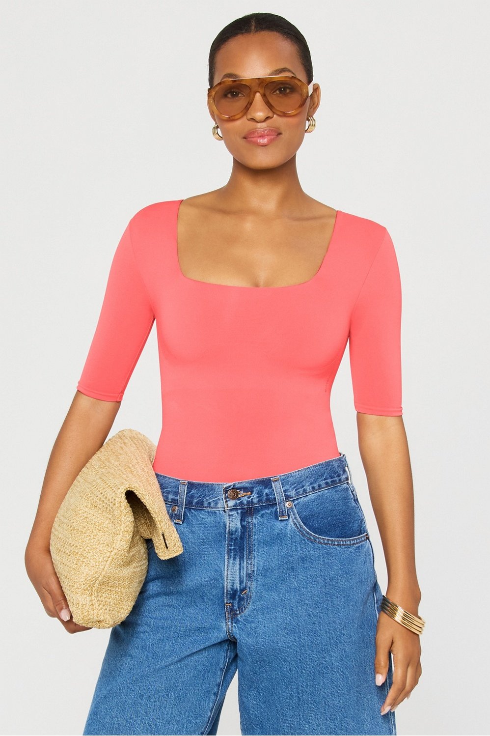 Your wardrobe’s secret weapon. Targeted shaping smooths your tummy, back, and arms, plus a hidden shelf bra that supports every cup size. Sleek and easy to style with a ¾ sleeve for the perfect amount of coverage. Runs small. Size up for your best fit.